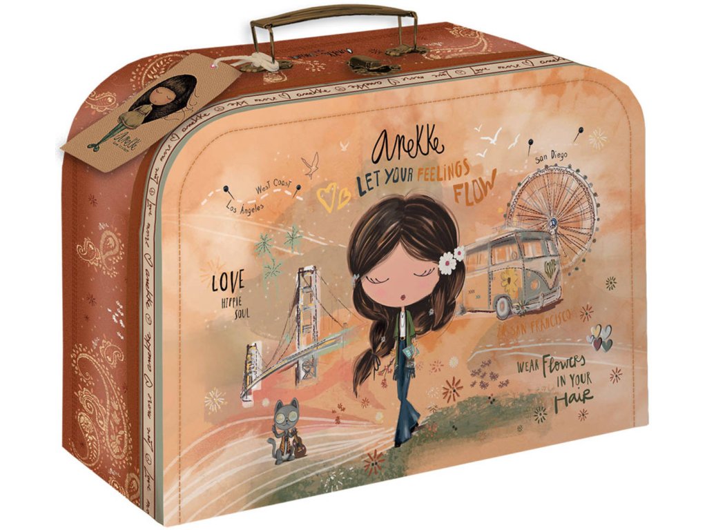 Papírový dětský kufřík velikosti 35cm s motivem známého děvčátka Anekke z dílny španělské designérky. Kufřík je vyroben z kvalitního pevného kartonu s vnitřní potiskem a kovovým uzavíráním s rukojetí. Je vhodný na školní potřeby, výtvarné potřeby, vejde se do něj i blok barevných papírů A4. Jeho využití v dětském světě je velké ... možnost uložení hraček ale i jiných drobností na cestu k babičce.
