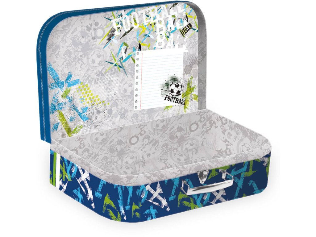 Dětský papírový kufřík s motivem Fotbal o velikosti 35 x 25 x 10cm, kovové ouško a zapínání, pevný karton. Školní lepenkový kufr s vnitřním potiskem.