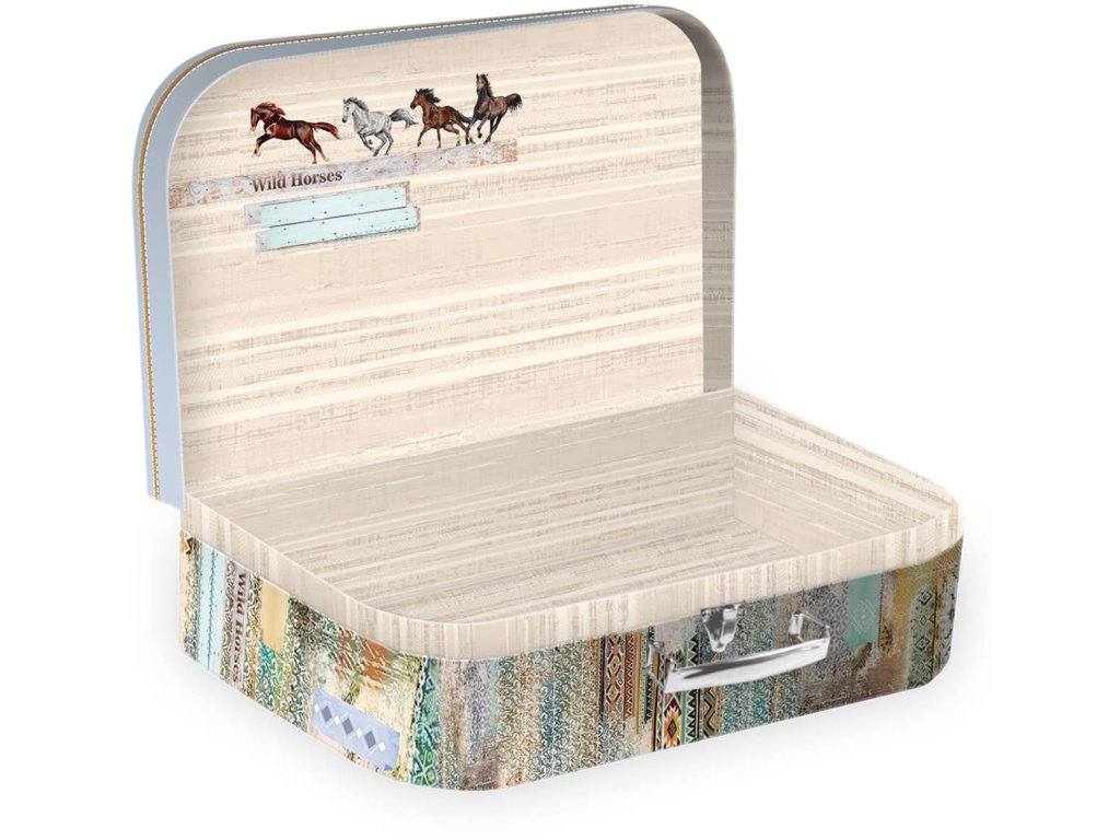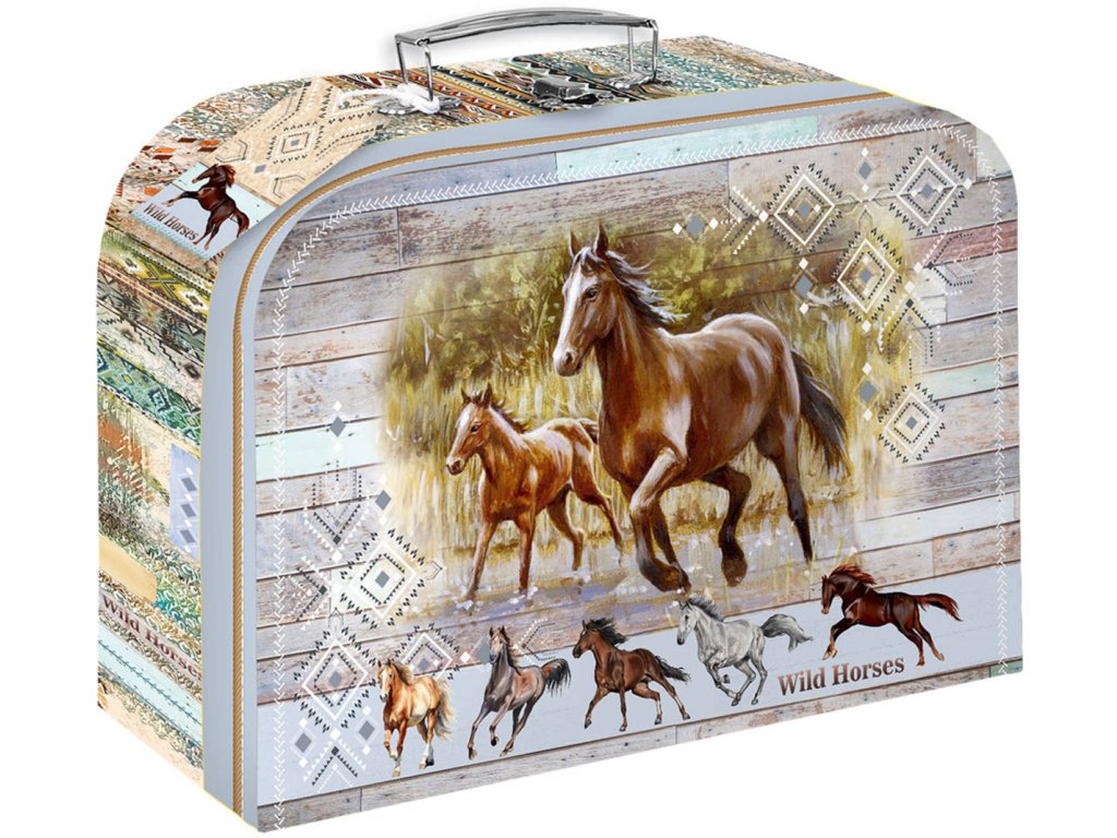 Dětský papírový kufřík s motivem Divocí koně o velikosti 35 x 25 x 10cm, kovové ouško a zapínání, pevný karton. Školní lepenkový kufr s vnitřním potiskem.