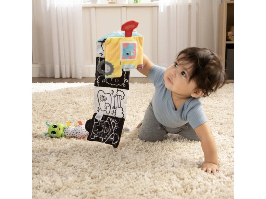 Multifunkční textilní rozkládací leporelo knížečka autobus od Lamaze, pro nejmenší děti, pro miminko. Obsahuje kousátko a zrcátko. Šustí, píská.
