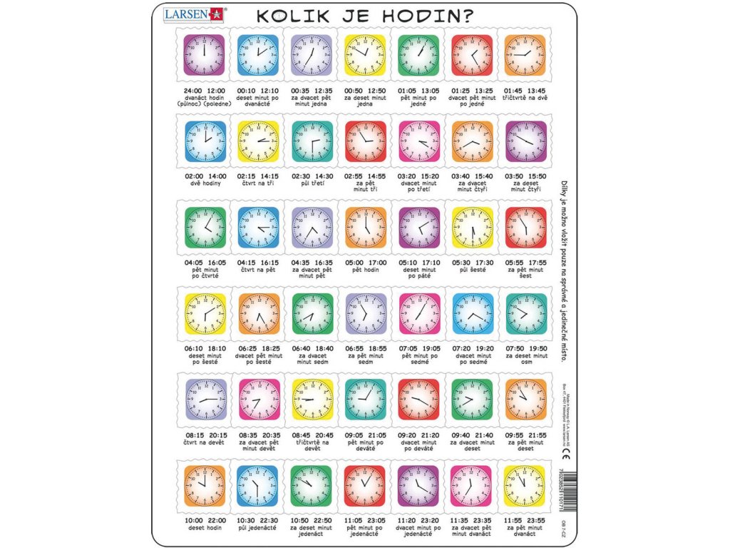 Kolik je hodin? Je čas na snídani, oběd nebo večeři? Naučte děti rozpoznávat čas na ručičkových hodinách zábavnou formou pomocí edukativního puzzle. Při skládání si děti osvojí základy orientace v čase. Kvalitní materiál a pevné dílky zajistí dlouhou životnost i při opakovaném skládání. Každý dílek má unikátní tvar a pasuje jen na své určené místo. Skládání podporuje logické myšlení, prostorovou představivost a trpělivost.