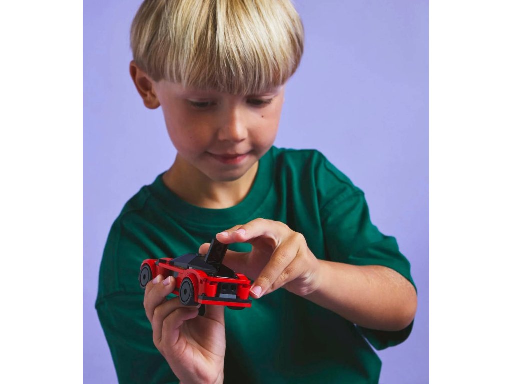 Potěšte svého malého milovníka automobilů od 5 let stavebnicí Červený sporťák. Tento elegantní model superauta má parádní ráfky, nízkoprofilové pneumatiky a kokpit s tónovaným sklem. Děti posadí minifigurku řidiče za volant, uloží do kufru mobilní telefon a čisticí prostředky a vyrazí na dálnici vstříc dobrodružství ve vysoké rychlosti! Součástí této stavebnice závodního vozu LEGO je tištění návod na stavění a 3D návod v doprovodné aplikaci LEGO Builder, která obsahuje nástroje přibližování a otáčení, aby si děti mohly během stavění prohlížet modely ze všech úhlů.