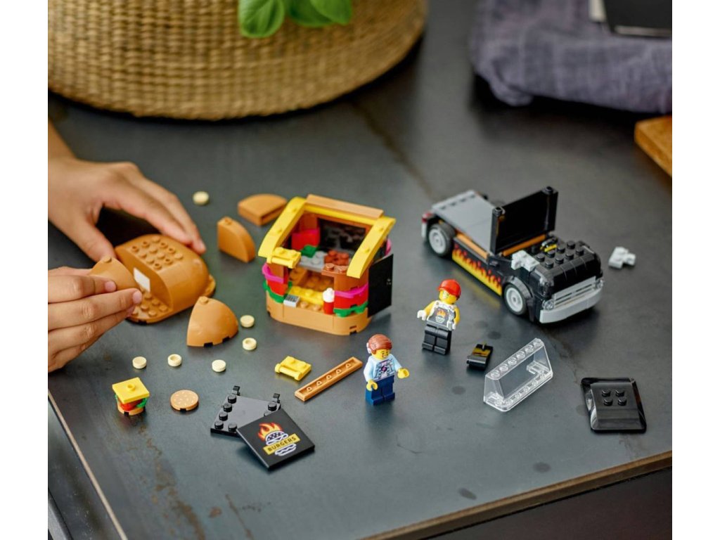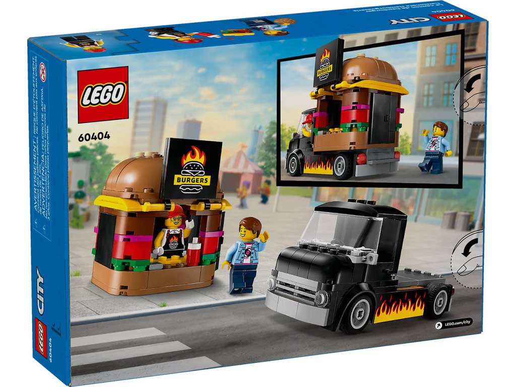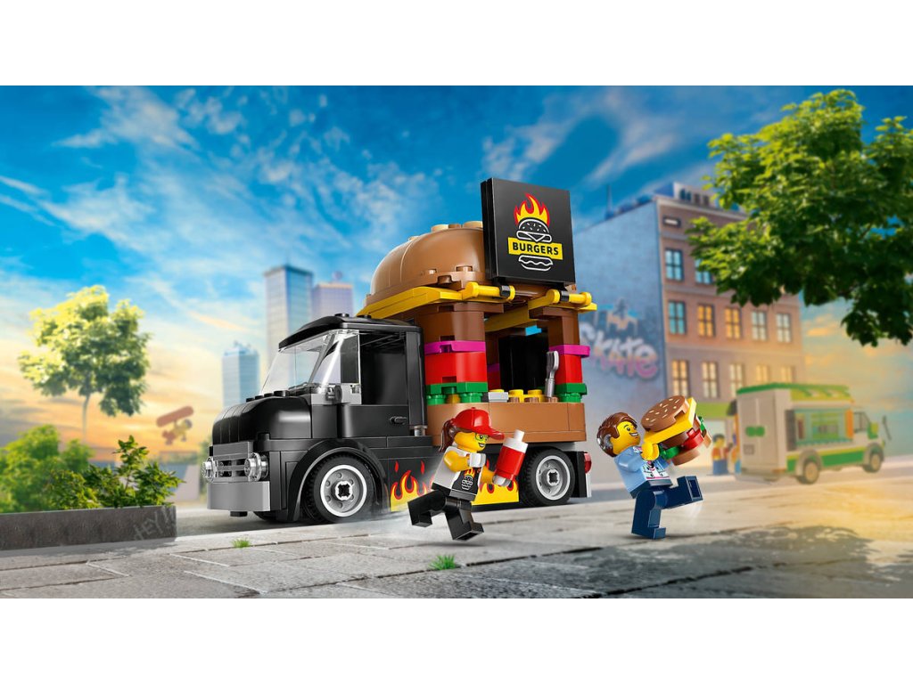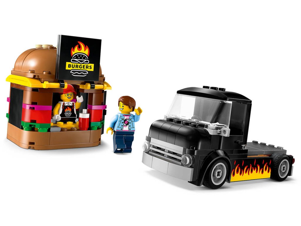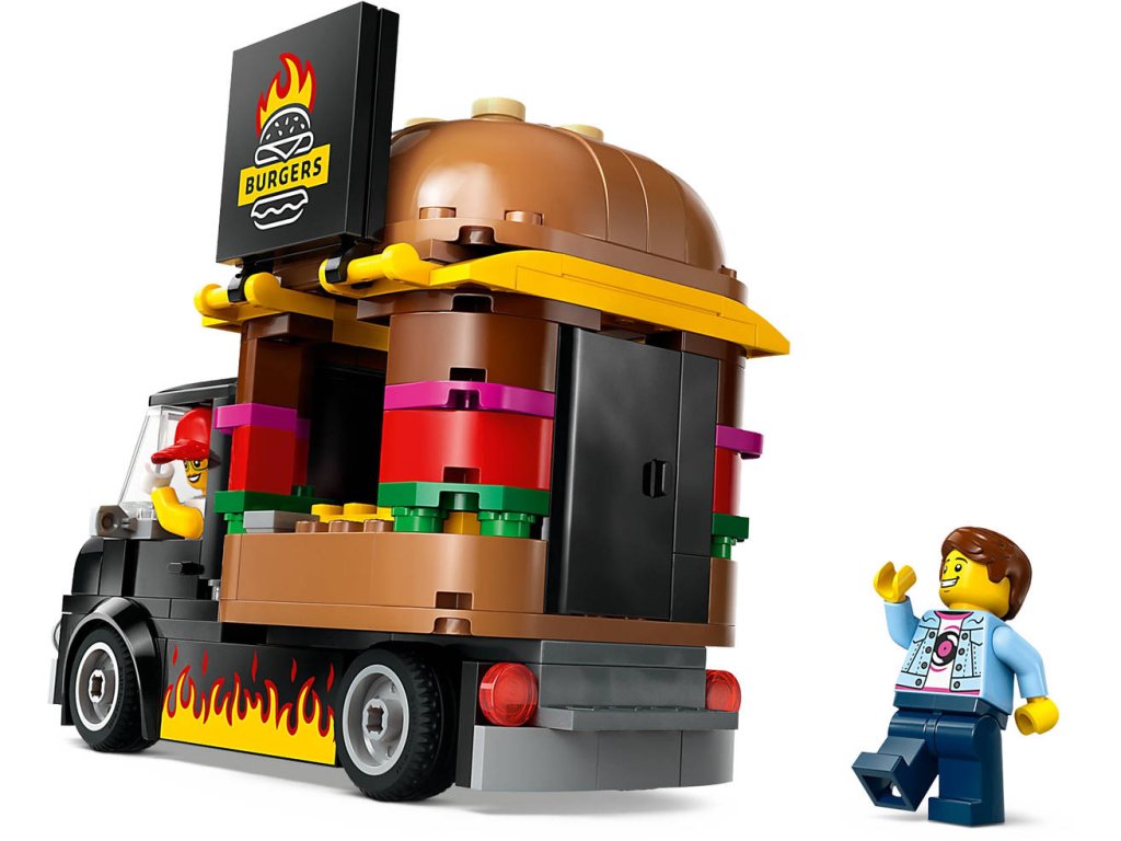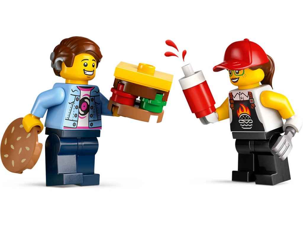 Stavebnice Hamburgerový truck rozproudí fantazii malých stavitelů od 5 let. Střechu pojízdné prodejny hamburgerů zdobí obří burger a propracovaný prostor na přípravu jídla s řadou omáček a dochucovadel lze vyjmout. Zvedněte dvířka a odhalte ceduli s burgerem grilovaným na ohni. Součástí stavebnice je také minifigurka prodejce a zákazníka s naslouchátkem. Návod na stavění modelu LEGO City Hamburgerový truck najdete v krabici – nebo si stáhněte aplikaci LEGO Builder, která dětem umožní prozkoumávat a ukládat si virtuální stavebnice, sledovat postup stavění a přibližovat, otáčet a prohlížet si modely ze všech úhlů, zatímco na nich pracují.