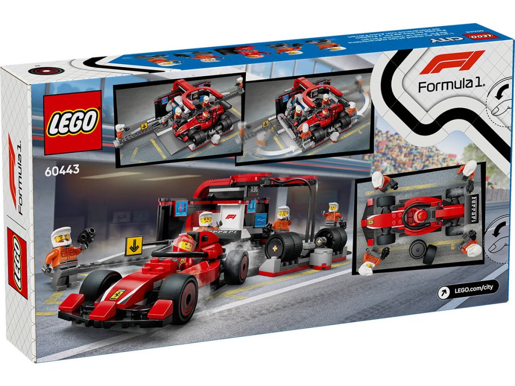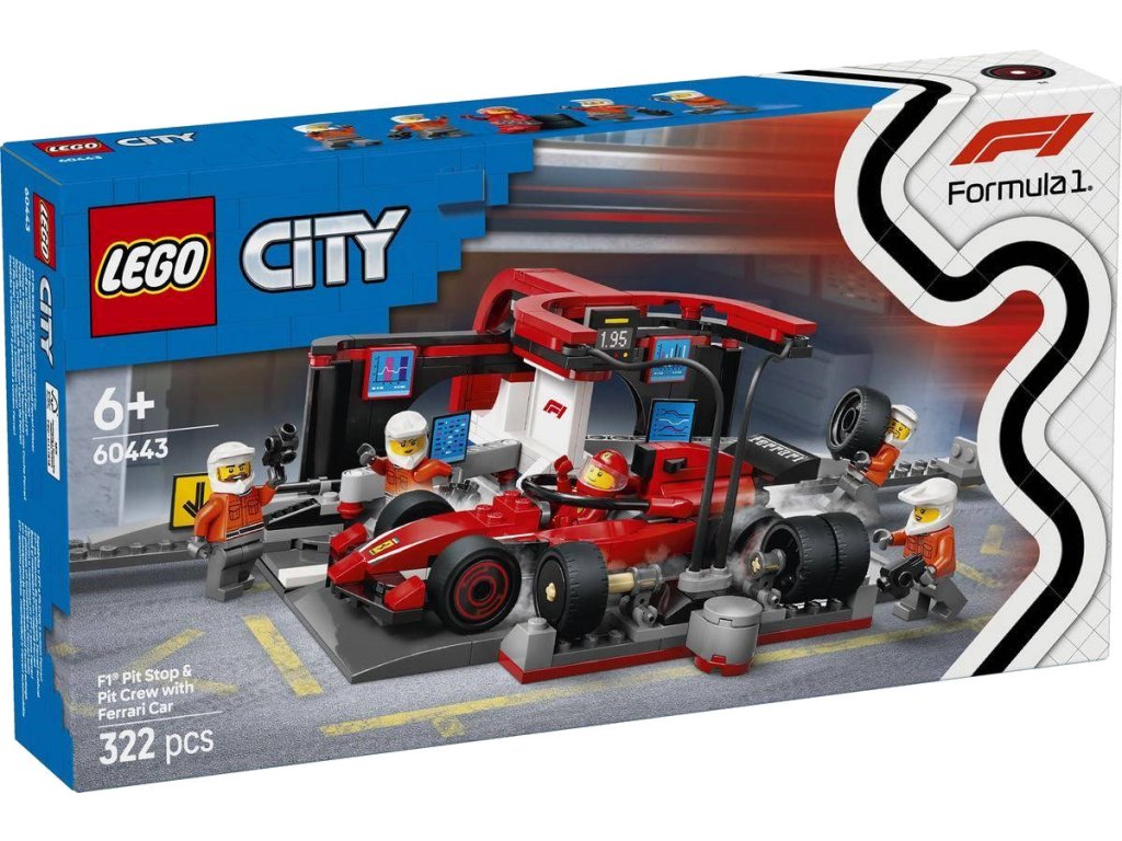 LEGO 60443 - Zastávka v boxech F1 a personál s vozem Ferrari z produktové řady LEGO CITY. Dětská plastová stavebnice v krabici.