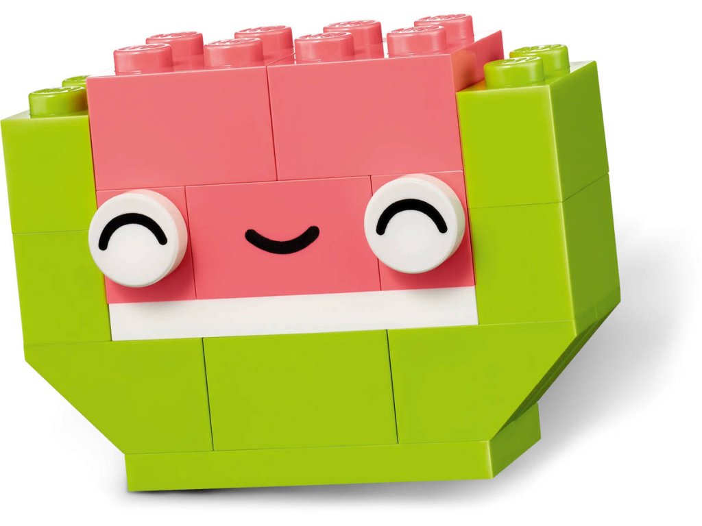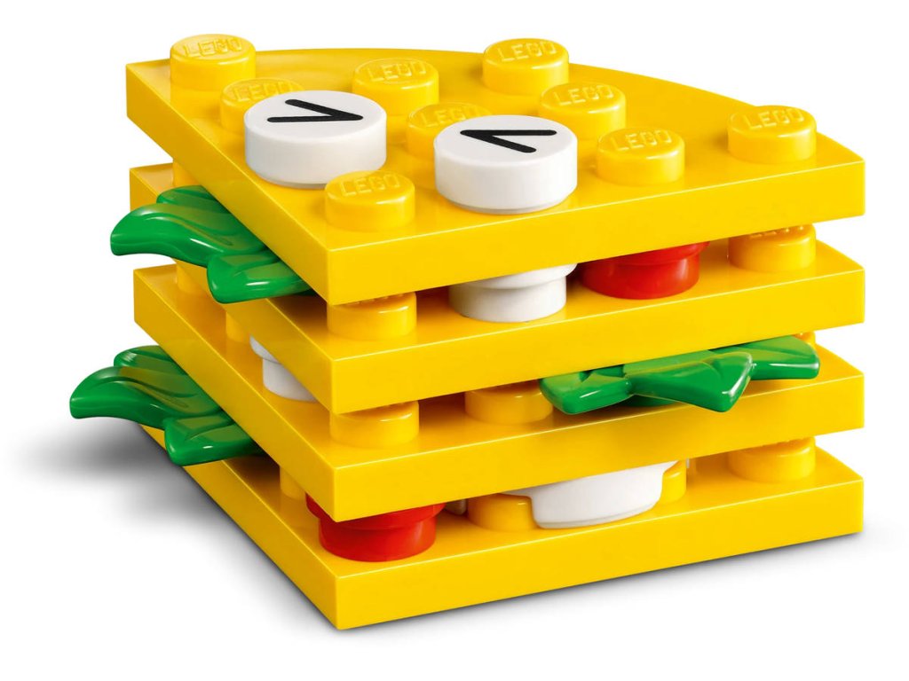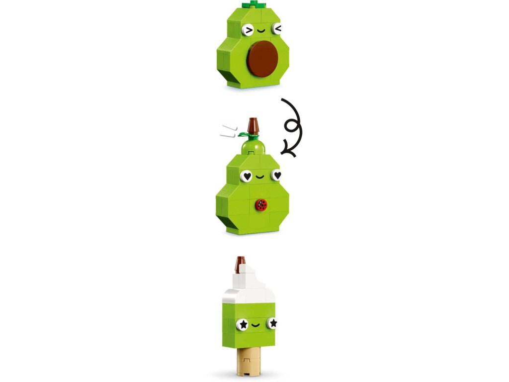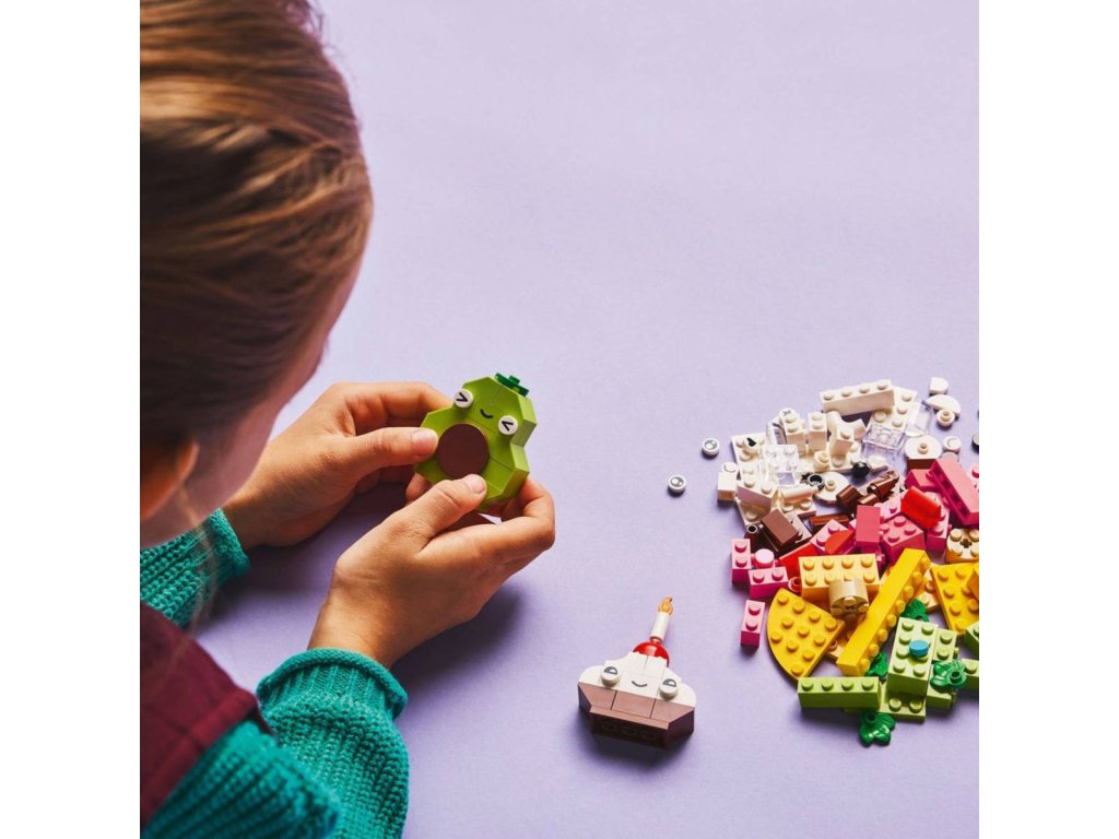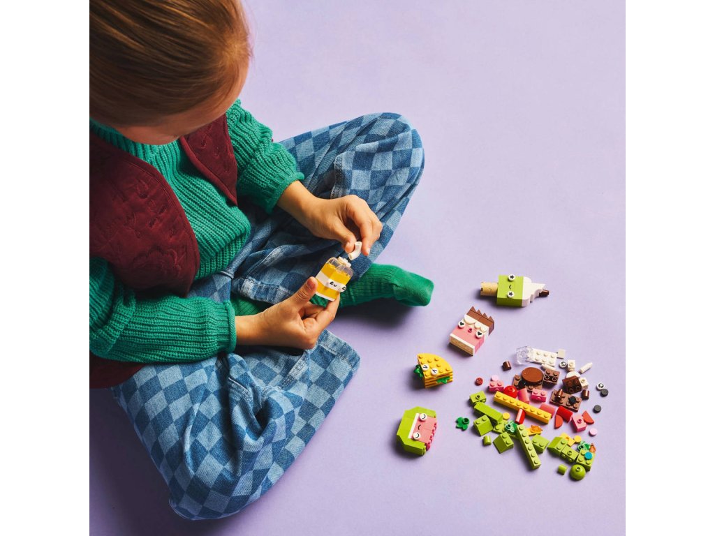 Všestranná stavebnice Kreativní jídlo je ideální pro děti od 4 let. S touto nápaditou hračkou si děti postaví řadu zábavných postaviček z jídla a užijí si celé hodiny hraní. Díky nekonečným možnostem zábavného stavění, přestavování a objevování tato stavebnice LEGO pro začínající stavitele pomáhá rozvíjet sebevědomí, soustředění a schopnost řešit problémy. Děti si pomocí pestrobarevných a poutavých kostek a speciálních dílků, jako jsou oči, ústa a řada dekorativních prvků, postaví 4 roztomilé hračky ze stavebnice Kreativní jídlo: Cupcake, zmrzlinu, avokádo a taco. Kreativní zábava bude pokračovat, když děti kostky promíchají a přestaví modely na dort s posypem, bubble tea, hrušku a panini. Až děti získají větší sebevědomí při stavění, mohou podle intuitivního návodu na stavění měnit jejich výrazy, tvary nebo barvy a poskládat si nové kamarády: Zelenou zmrzlinu, krabici džusu, kousek melounu, čokoládovou tyčinku a mega sendvič.