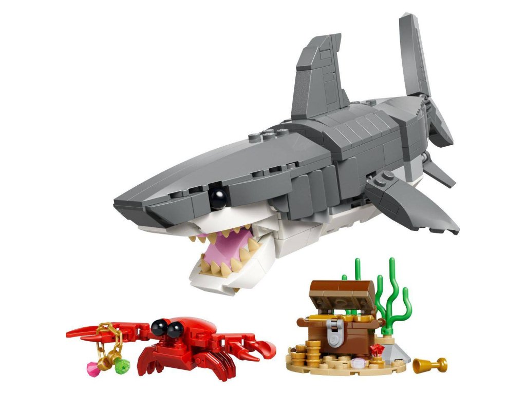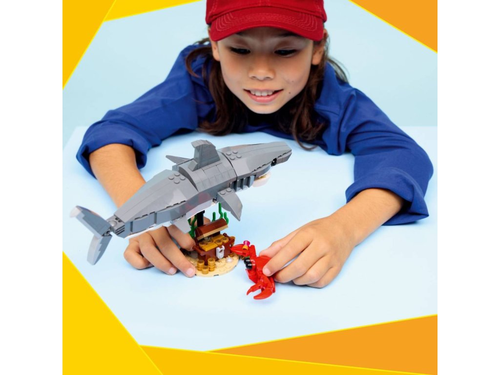 Kluci a holky od 8 let se se stavebnicí Divoký žralok a truhla s pokladem vydají na zábavná podmořská dobrodružství. Tato působivá zvířecí hračka dětem nabízí 3 různé možnosti stavění ze stejné sady kostek. Můžou sestavit pohyblivou hračku žraloka, kterou pak vystaví na podstavci s truhlou s pokladem a krabem. Pak model můžou přestavit na mořského ďasa na podstavci s mořskými rostlinami nebo na pohyblivou mantu na podstavci s mušlí. A si děti dohrají, každý z modelů si můžou vystavit jako dekoraci na poličce nebo na stole.