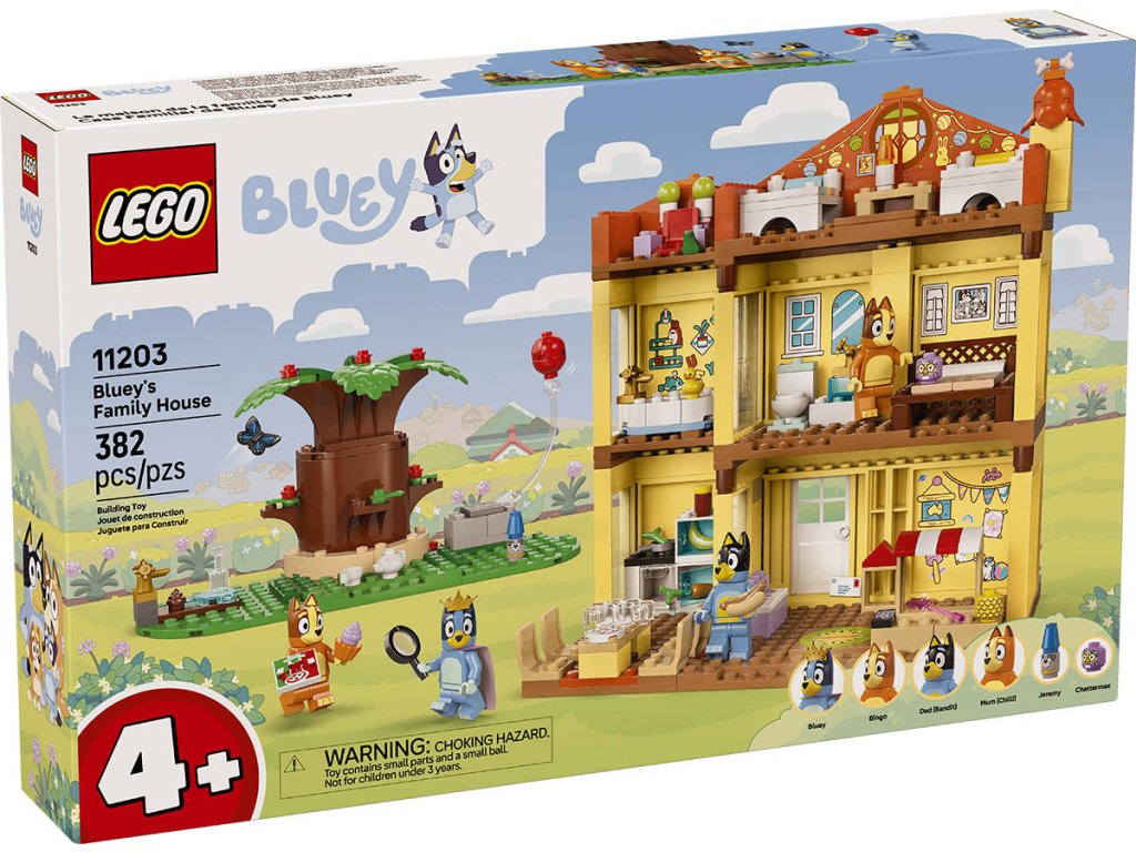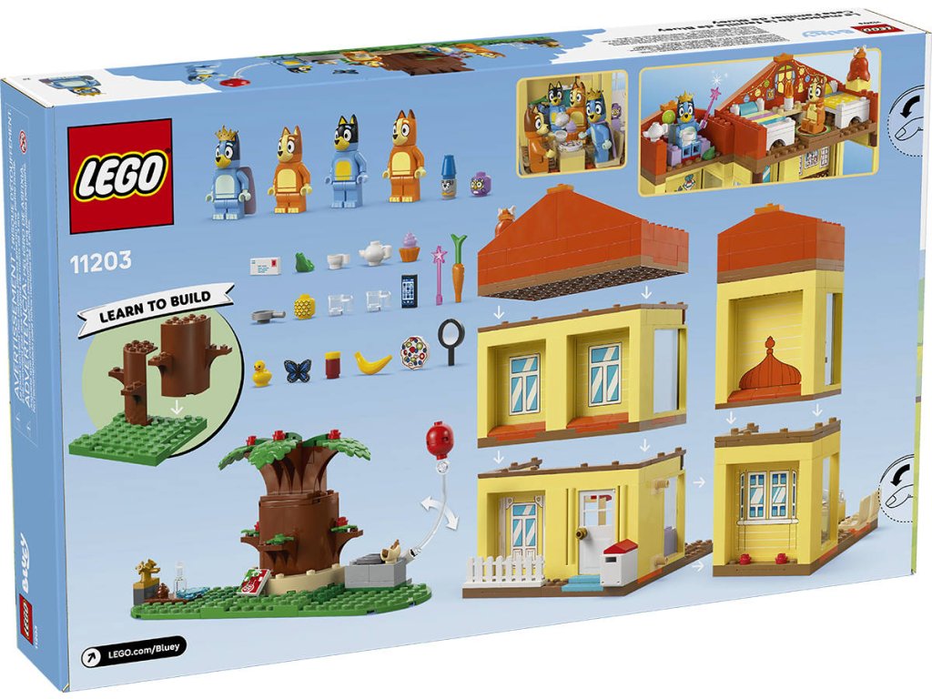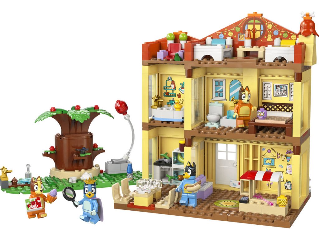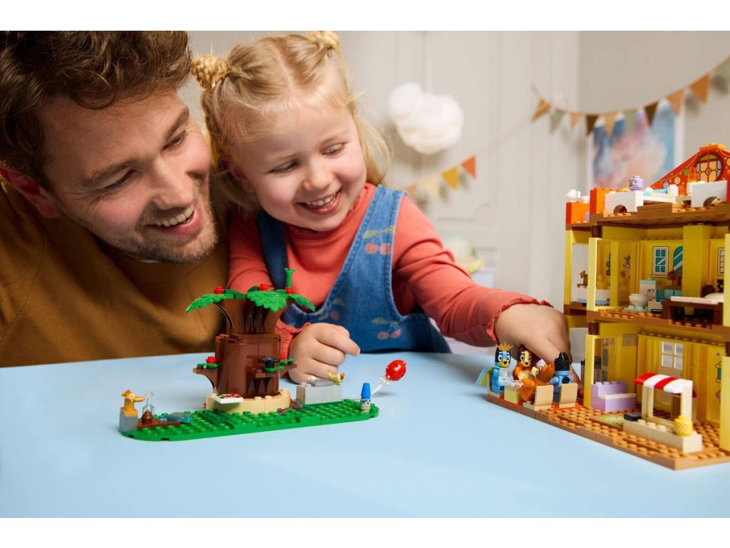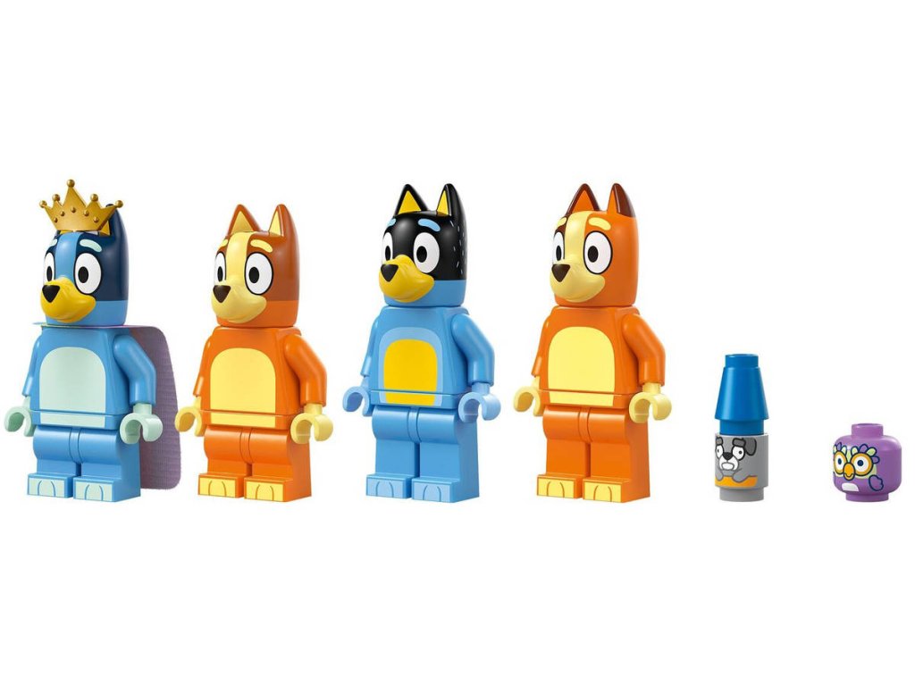 Kvalitní stavebnice Bluey a její rodinný dům je plná funkcí, hraček a postav z televizního seriálu Bluey, který inspiruje děti od 4 let k vymýšlení tvořivých her s Bluey a její rodinkou. Modulární domeček s několika místnostmi obsahuje 4 minifigurky – Bluey, Bingo, Chilli (Blueinu maminku) a Bandita (Blueina tatínka) – a řadu doplňků včetně duhového pláště, hůlky a lupy. Děti můžou všechny místnosti odpojit a užít si tak spoustu způsobů hraní. Uvnitř herny najdete domeček pro panenky, klavír a stánek s jídlem. V kuchyni je lednice, trouba, sporák, stůl a židle. V horním patře se nachází ložnice mámy a táty a koupelna. V podkrovním pokojíčku Bluey a Bingo je koberec, lampa a figurka Kecala. Ve vedlejším pokoji najdete královnin trůn s čajovou konvicí, šálkem a žábou. Na zahradě je velký strom, párek v rohlíku, pizza, vodovodní kohoutek, trpaslík Jeremy a balón, který postavičky můžou házet do vzduchu.