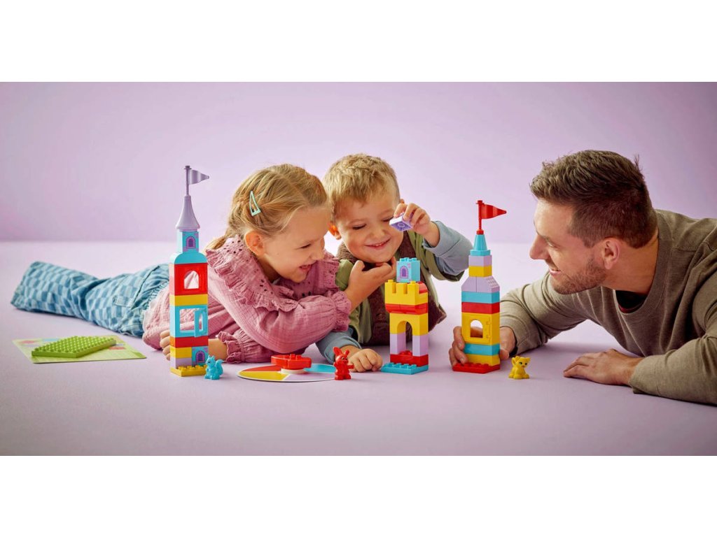 Užijte si se svou ratolestí hodiny rodinné zábavy a pomozte jí učit se hrou se stavebnicí 2 v 1 Hopsy a hra s hradem. Děti se vydají na vzdělávací dobrodružství LEGO DUPLO a procvičí si počítání a třídění barev během hraní jedné ze dvou zábavných her. Děti se naučí poznávat barvy a čísla během kreativního stavění modelu hradu. Tato zábavná rodinná aktivita začíná tím, že si každý hráč vybere zvířátko a poté roztočí šipku, aby zjistil, o kolik míst na hrací ploše se může posunout. Do modelu pak přidá jednu kostku v té barvě, na které přistál. Hra končí, když všechny postavy dorazí na hrad. Ve druhé hře děti třídí barvy, aby zjistily, kdo dokáže postavit nejvyšší věž. Každý hráč roztočí šipku a zjistí, jakou barvu kostky může přidat do svého modelu. S touto vzdělávací stavebnicí si děti procvičí řadu dovedností, jako je střídání během hry, představivost a používání jemných motorických schopností během kreativního stavění nebo spolupráce s týmem během stavění hradu.