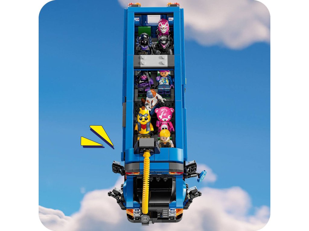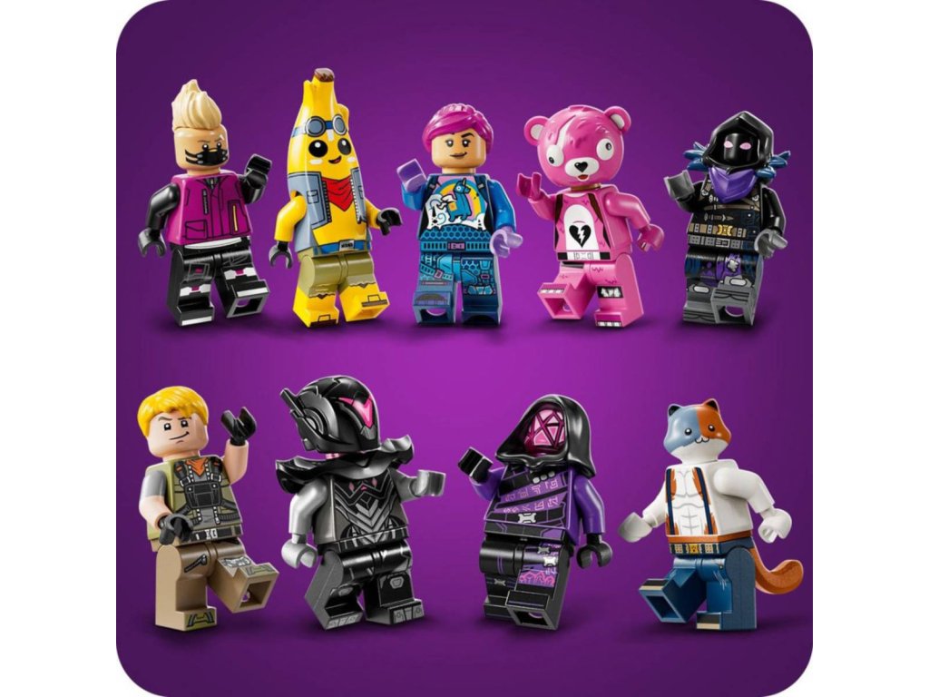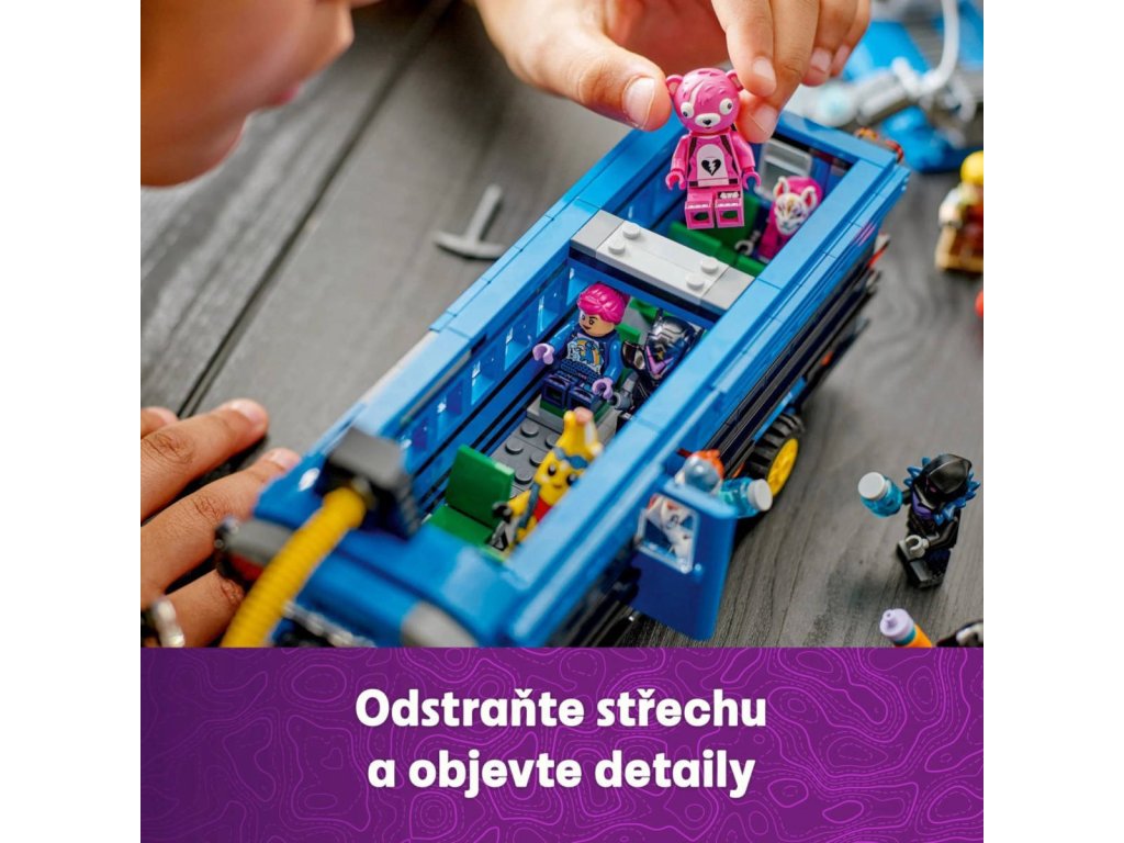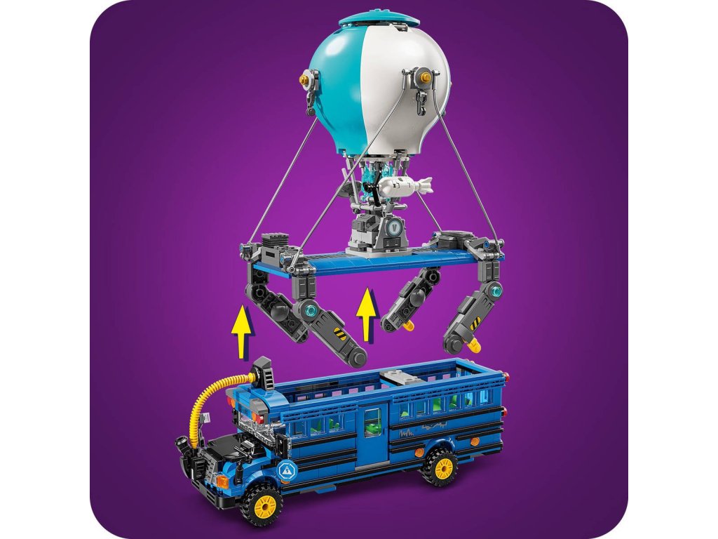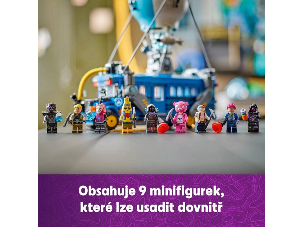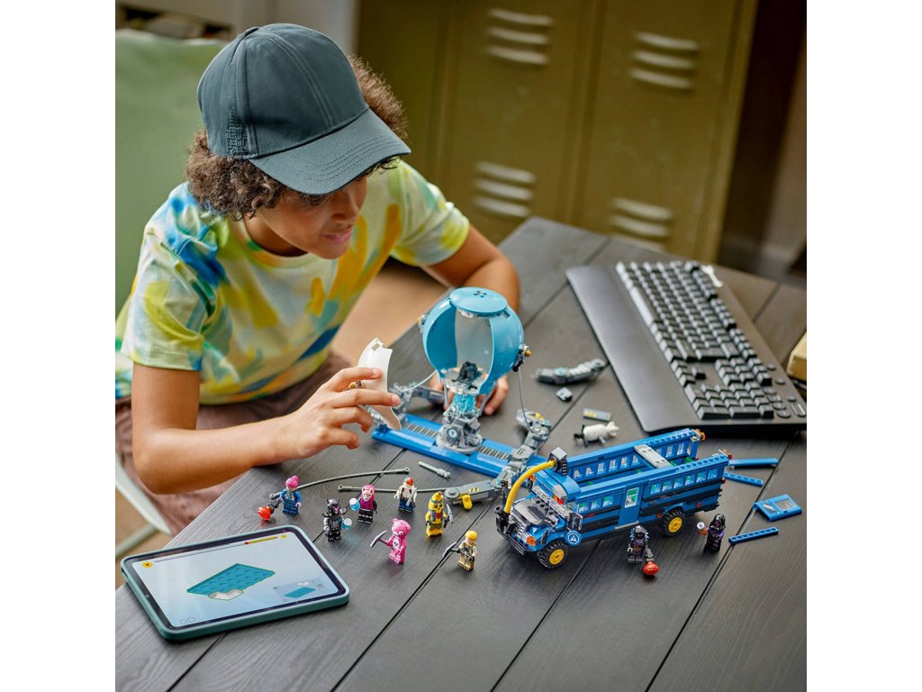 Popusťte uzdu představivosti se stavebnicí Battle Bus pro fanoušky od 10 let. Stavebnice je inspirovaná strhující videohrou a hráči si s ní postaví parádní vozidlo z Fortnite. Fanoušci se vydají do strhujícího světa LEGO Fortnite a postaví autobus s pojízdnými koly, odnímatelnou střechu a slavným horkovzdušným balónem. Ale to je jen začátek! Po sestavení autobusu se mohou těšit na objevování doplňků, jako je Slurp Juice, Grappler, Pickaxes, Slap Juice a 9 minifigurek slavných outfitů ze hry Fortnite. Minifigurky můžete usadit do autobusu a pustit se do kreativního hraní. Jakmile si děti se sběratelskou hračkou dohrají, stane se z ní úžasný dekorativní kousek z kostek LEGO, který si hrdě vystaví v pokojíčku nebo v herně. Představuje také promyšlený dárek pro hráče a fanoušky LEGO Fortnite, kteří při skládání této stavebnice dosáhnou nové úrovně kreativity.