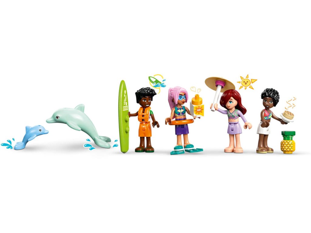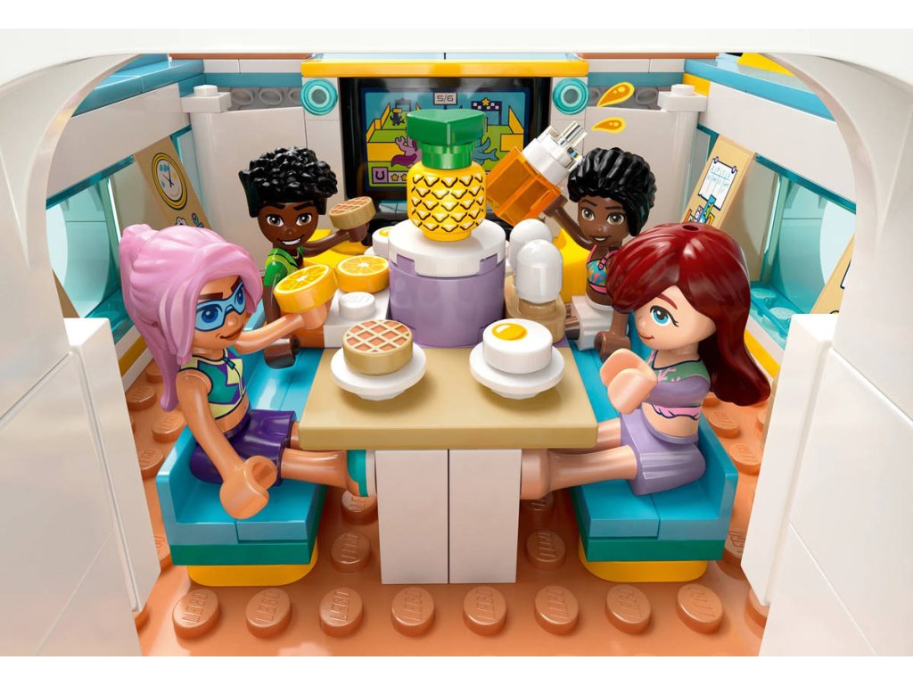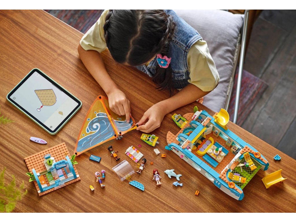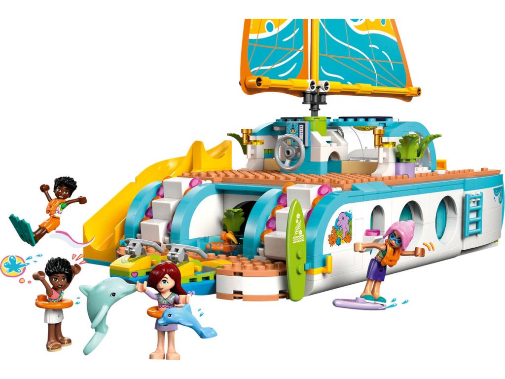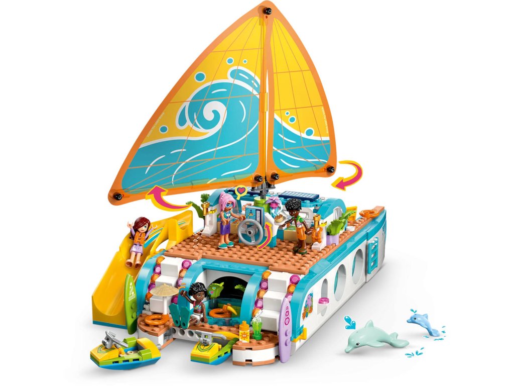 Představujeme vám zábavnou dárkovou stavebnici, která potěší všechny malé cestovatele! Stavebnice Dobrodružství na jachtě pro holky a kluky od 8 let obsahuje 4 minipanenky LEGO Friends a spoustu doplňků pro nápadité hraní. Propracovaná loď je plná realistických prvků, jako je plachta, která se pohybuje, když děti otáčejí kormidlem! Děti si vymyslí příběhy o Paisley, Zacovi, Celine a Sky, kteří se vydali na dobrodružnou plavbu lodí. V lodi najdete prostor na vaření, stolování, odpočinek a spaní - takže se skvěle hodí na vymýšlení nových příběhů. Objevte vířivku s nafukovačkou, herní koutek, prostor na spaní se 4 postelemi, sprchu a toaletu. Odejměte horní část jachty a získejte přístup k propracované kuchyňce s jídelnou. Děti objeví celou řadu doplňků během vaření a stolování s postavami. Mezi další prázdninové doplňky patří dalekohled na pozorování samice delfína a jejího mláděte, 2 vodní skútry, surf, ploutve, herní ovladače a další.