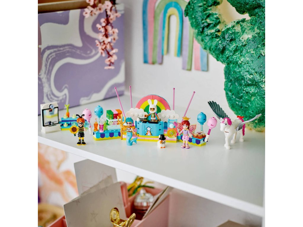 Stavebnice Kostýmová párty s jednorožcem a vílou pro holky a kluky od 6 let obsahuje 4 minipanenky LEGO Friends, figurku kočky a figurku koně a nechybí spousta roztomilých párty doplňků, které inspirují k zábavnému hraní. Děti si vymyslí vlastní zábavné příběhy a zahrají si na společenské situace s kamarády, kteří si zkoušejí kostýmy. Autumn je převlečená za čmeláka a Olly má kostým mořského muže. Připojí se k nim i kocour Churro v kostýmu kouzelníka a Leo v kostýmu králíčka. Paisley má na sobě kostým víly a kůň Periwinkle se promění v jednorožce. Kamarádi si užijí párty s pódiem, djským koutkem a občerstvením. Nechybí fotokoutek se zábavnými doplňky, kde kamarádi nafotí zábavné fotky!