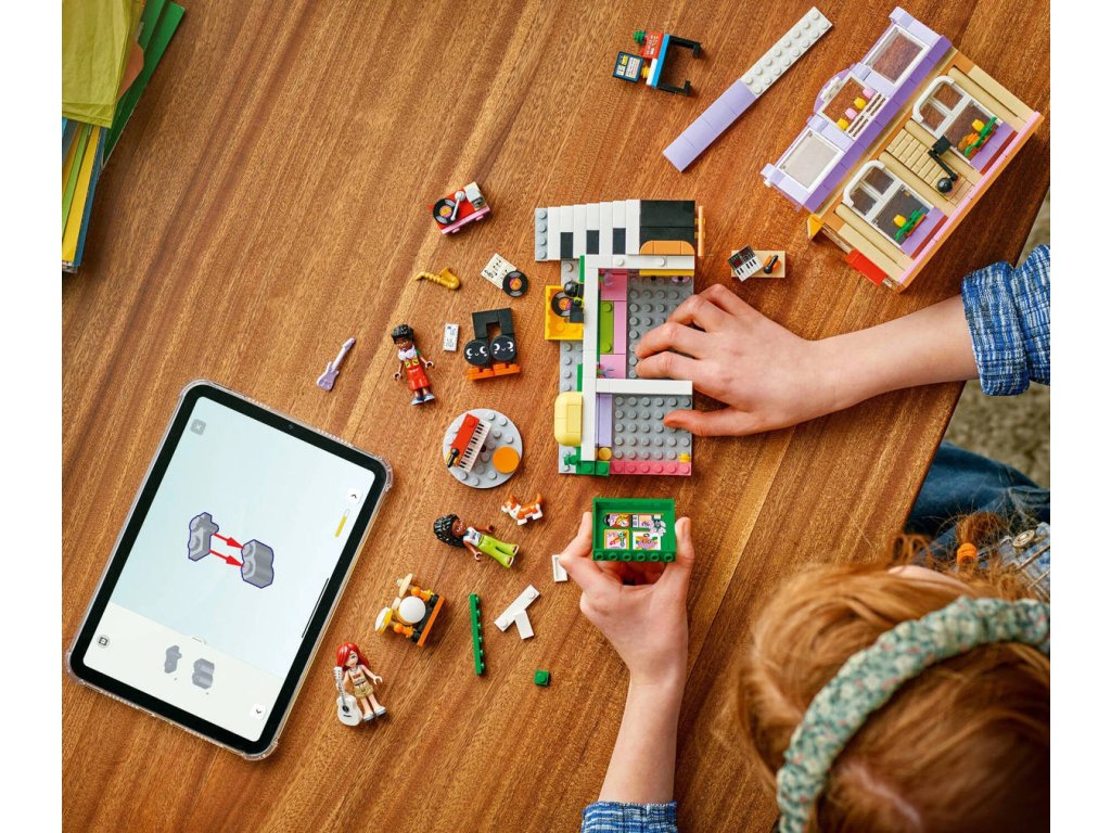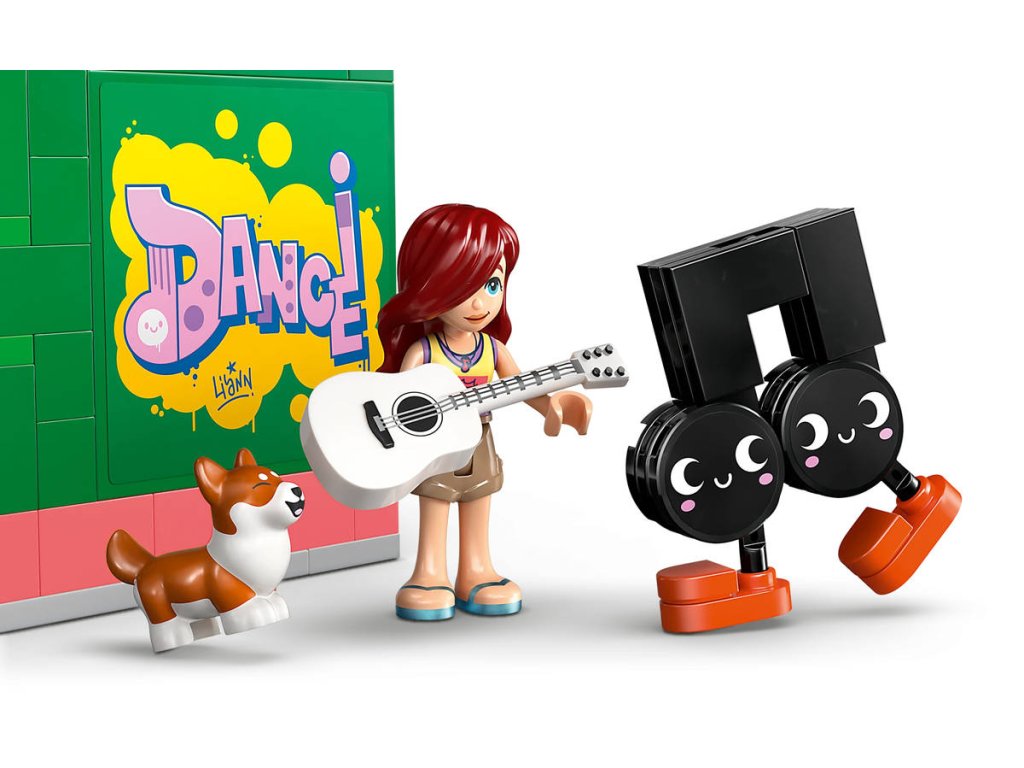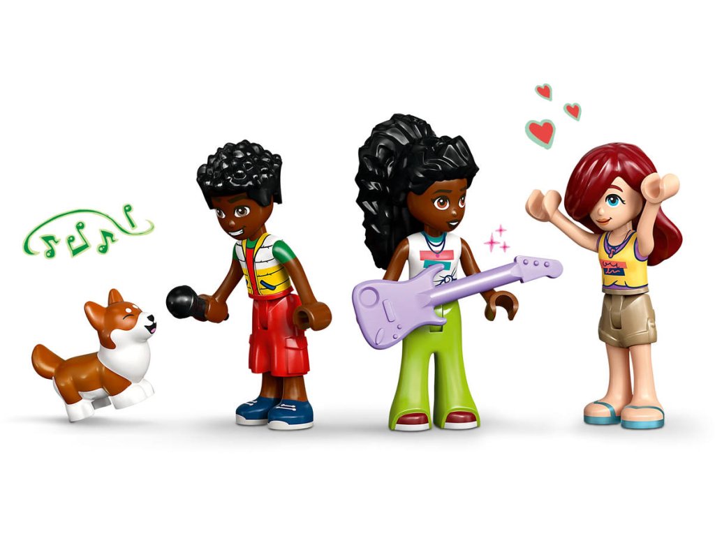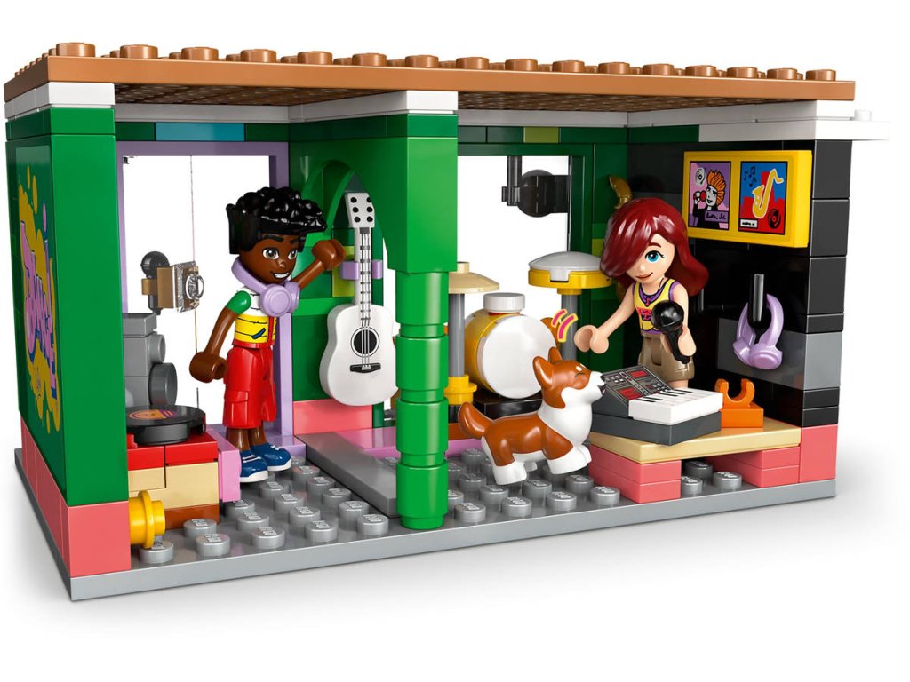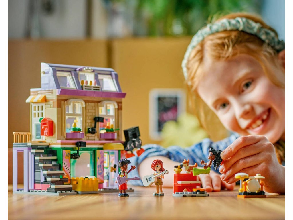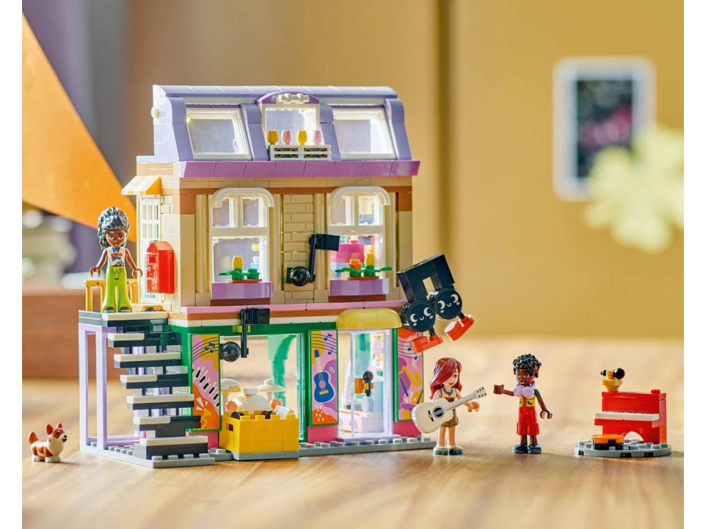 Připravte se na překrásné tóny s touto stavebnicí s hudební tematikou. Stavebnice Obchod s hudebninami a byt pro holky, kluky a milovníky hudby od 7 let obsahuje 3 minipanenky LEGO Friends, figurku corgiho a doplňky, které inspirují k nápaditému hraní. Děti si poslechnou hudbu s Paisley, Zacem a Elsou D a prozkoumají různé nástroje v obchodě s hudebninami, včetně bicích, kytary a saxofonu. Nechybí pouliční piano, u kterého corgi Marimba rád „zpívá“ do mikrofonu. Pestrobarevná budova je zdobená zábavným odnímatelným maskotem v podobě noty a nechybí schodiště s motivem klavíru, které vede do útulného bytu Elsy D. Byt je plný krásných detailů, včetně dvířek pro psa, pelíšku pro psa, poštovní schránky, kuchyňky, psacího stolu a žebříku vedoucího k posteli v podkroví. Tato propracovaná stavebnice obsahuje také spoustu doplňků, včetně gramofonu, syntezátoru a sluchátek, se kterými si děti zahrají na různé společenské situace.