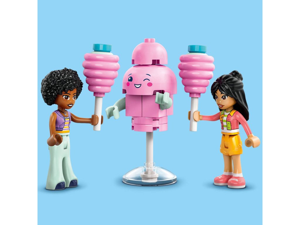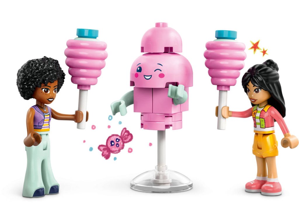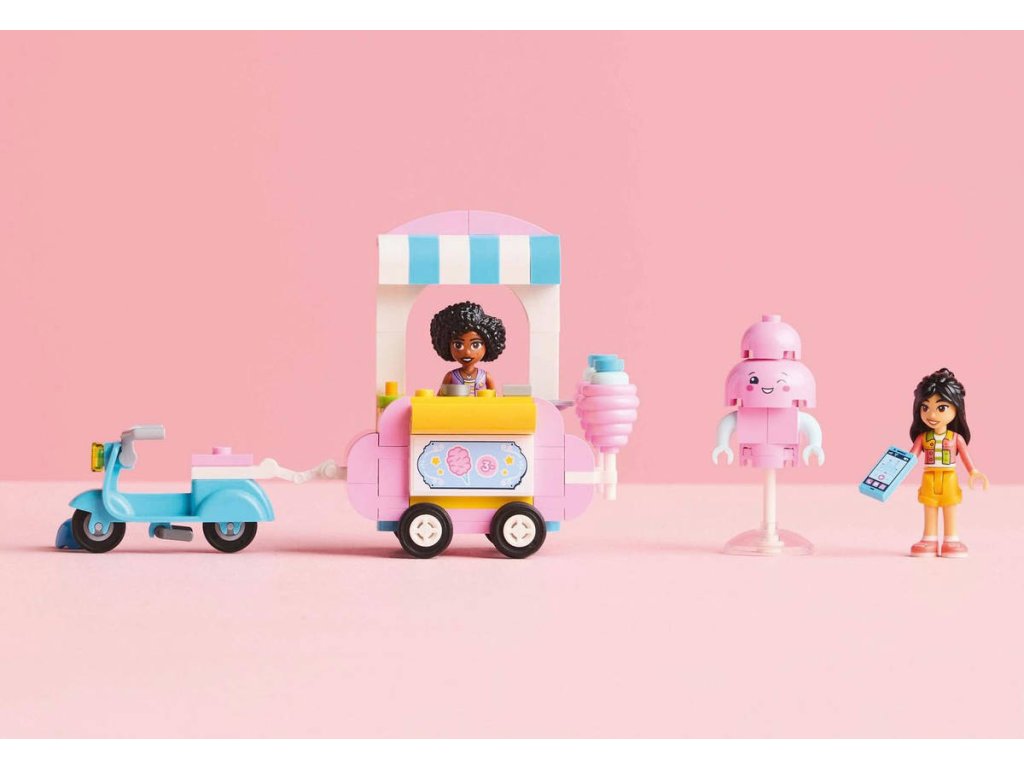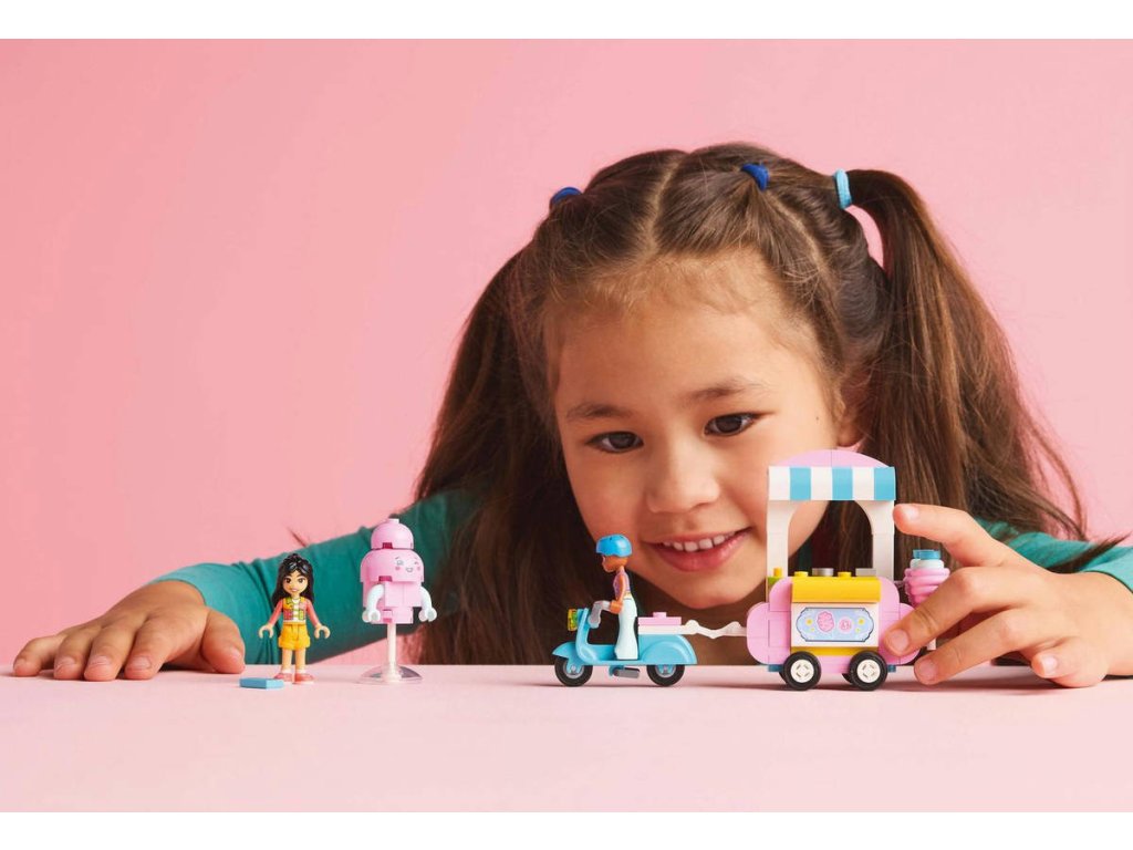 Inspirujte děti od 6 let k sladké hře na postavy se stavebnicí Stánek s cukrovou vatou a skútr. Součástí stavebnice jsou 2 minipanenky LEGO Friends a sestavitelný pojízdný vozík s občerstvením, skútr, maskot a doplňky. Holky, kluci a malí stavitelé, kteří milují kreativní hraní, si s touto stavebnicí užijí hodiny hraní vlastních zábavných příběhů. Vymyslí příběh Liann a Jamily, které rády tráví čas u stánku s cukrovou vatou. Součástí vozíku LEGO na kolečkách je miska s ozdobami na přípravu cukrové vaty. Nechybí ani pokladna a peníze, takže si děti můžou zinscenovat různé interakce se zákazníky.