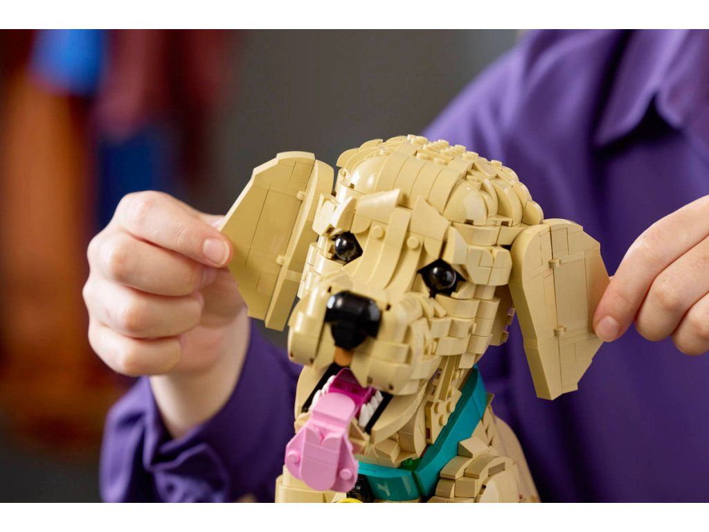 Užijte si stavitelský projekt se stavebnicí Štěně zlatého retrívra pro dospělé, který zahřeje u srdce. Tato pohyblivá figurka zvířete zachycuje kouzlo oblíbeného psího plemene a zamilují si ji všichni milovníci zvířat a zlatýchretrívrů. Napolohujte hlavu, uši a ocas figurky štěněte, zvedněte jeho přední tlapku a vytvořte různé roztomilé výrazy. Otevřete tlamu štěněte a odhalte řady bílých zoubků a vložte dovnitř růžový jazyk, který figurce dodá ještě více charakteru. Tento r oztomilý pejsek z kostek LEGO s barevným obojkem a medailonkem poslouží jako krásná dekorace každého prostoru. Stavějte s aplikací LEGO Builder – přibližujte a otáčejte model ve 3D, sledujte svůj pokrok, ukládejte postup a stavějte podle podrobného digitálního návodu.