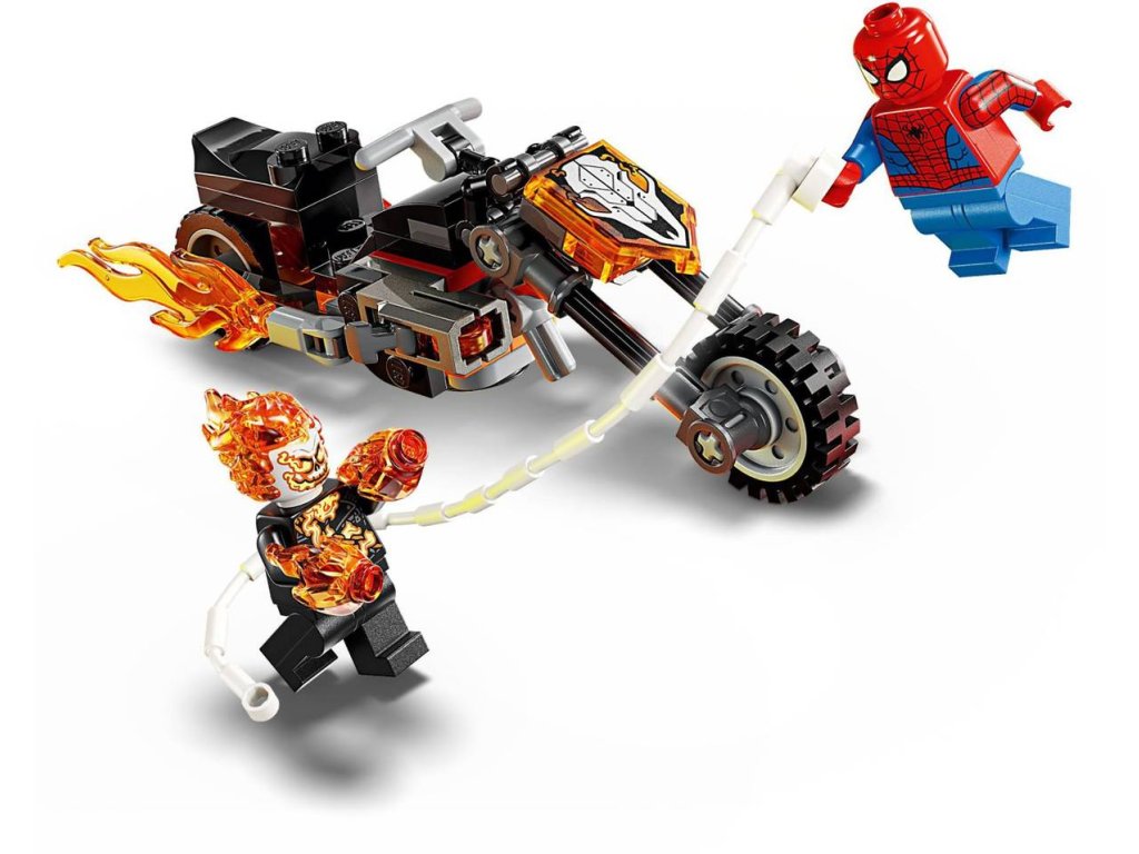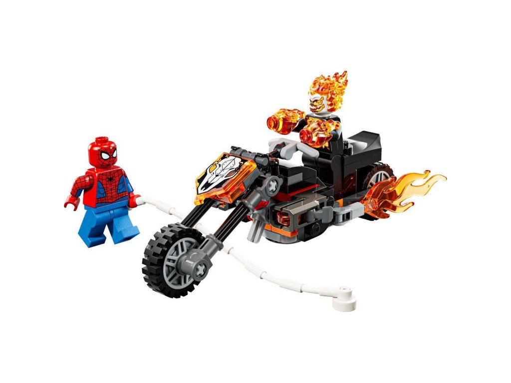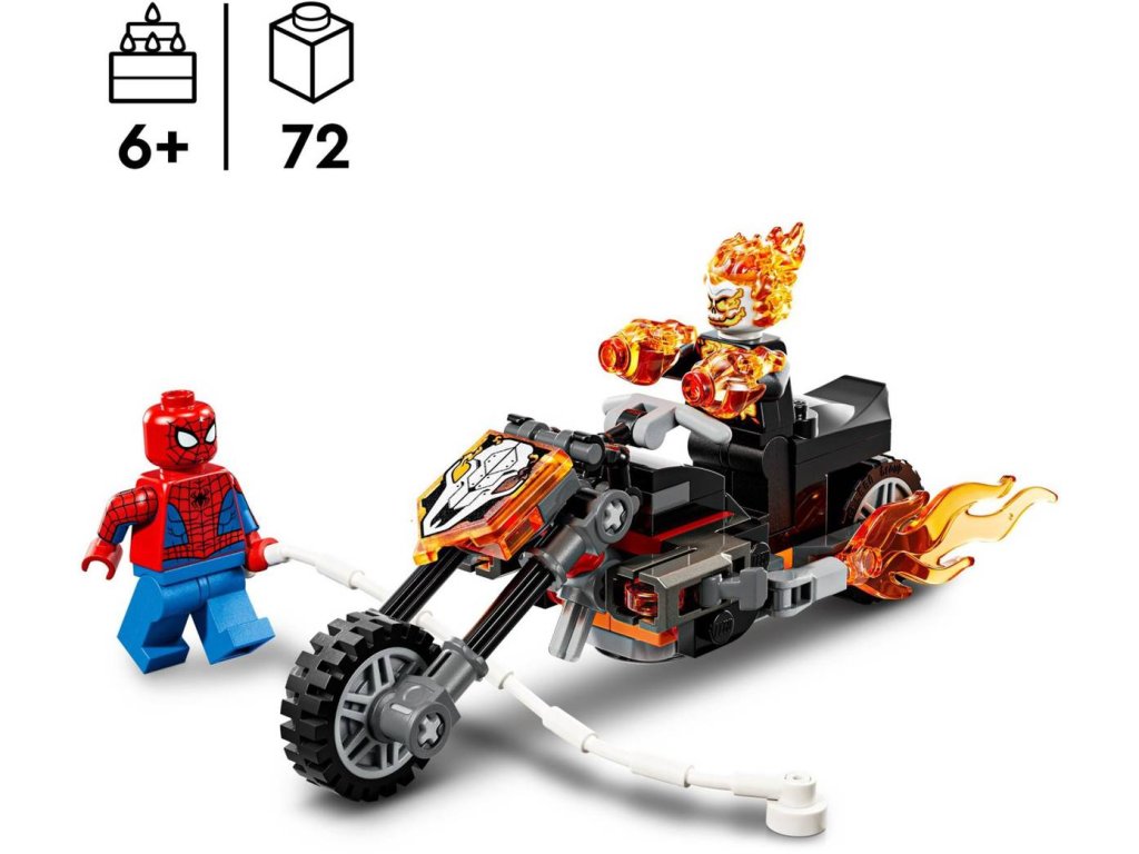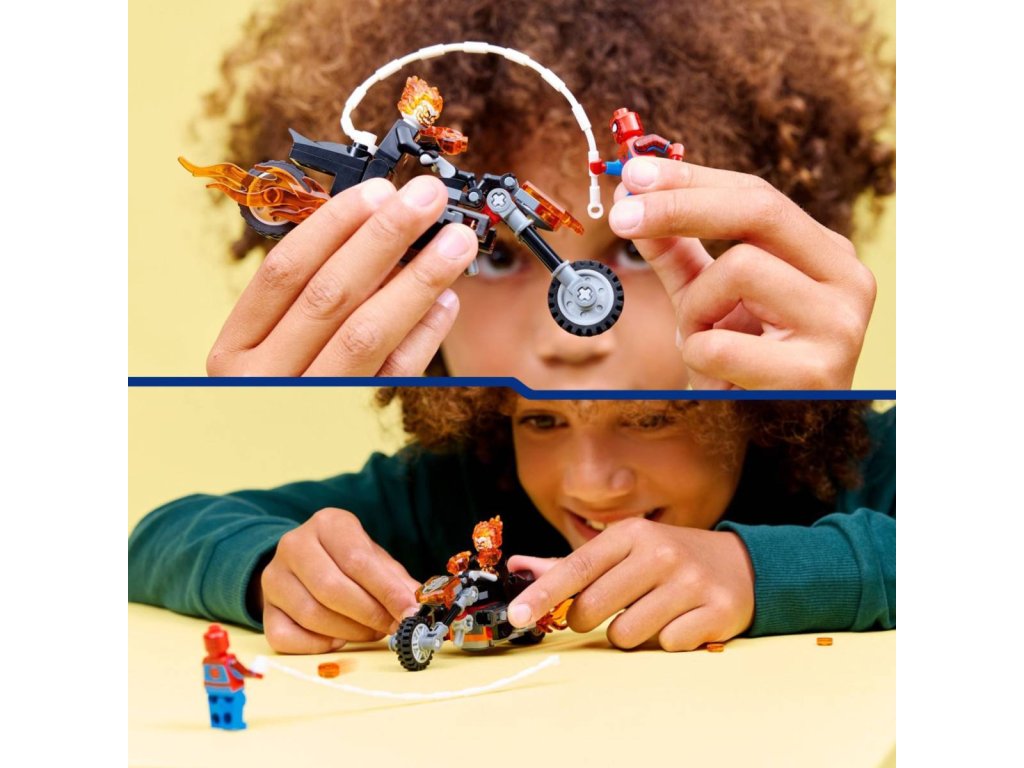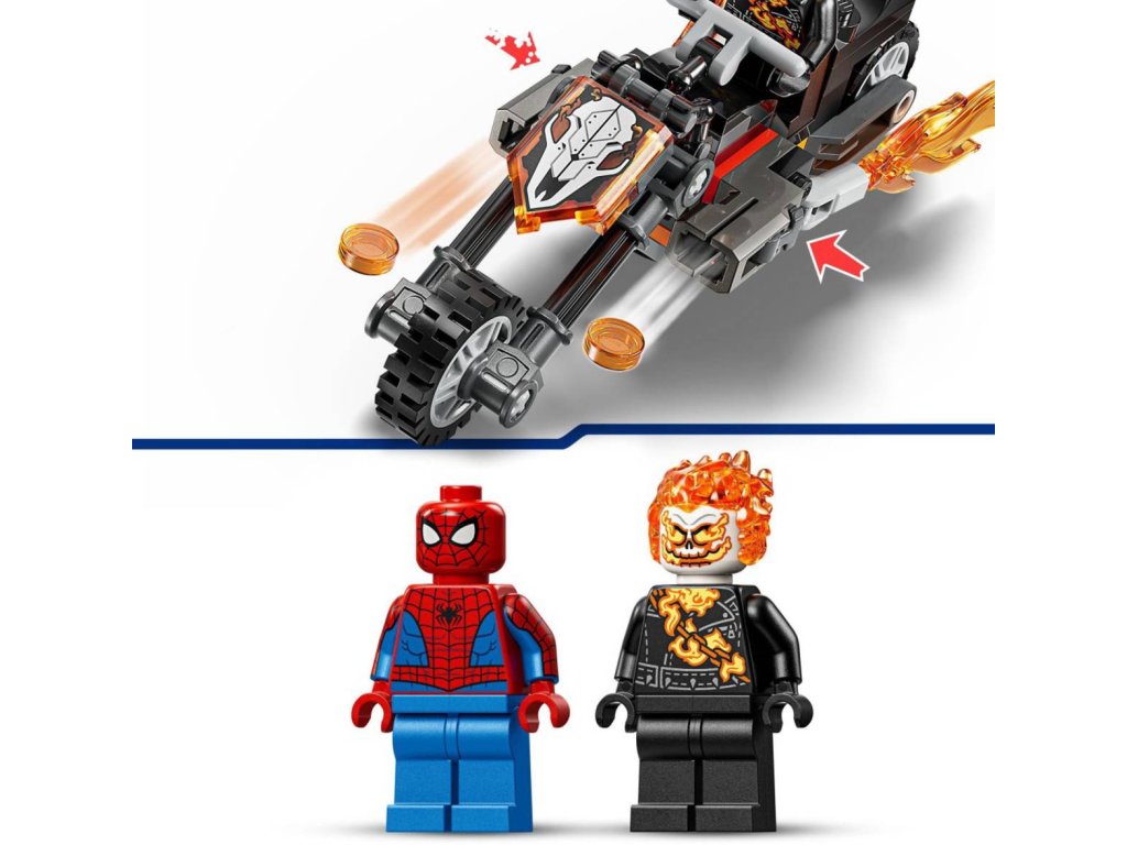 Vydejte se na superrychlou honičku se superhrdiny se stavebnicí Spider-Man vs. Ghost Rider na motorce pro holky a kluky od 6 let. Stavebnice LEGO Marvel s bojovou motorkou a dynamickou minifigurkou Spider-Mana a Ghost Ridera inspiruje děti k nápaditému hraní. Ghost Rider je minifigurka kostlivce s plameny šlehajícími z rukou a hlavy. Jeho ikonická motorka má 2 hořící výfuky a 2 vestavěné vystřelovače. Připevněte pavučinové lano minifigurky Spider-Mana k motorce a užijte si nekonečné možnosti hraní – ať už s motorkou, nebo bez ní! Tato stavebnice představuje skvělý dárek k narozeninám pro malé superhrdiny, stavitele LEGO a fanoušky Spider-Mana.