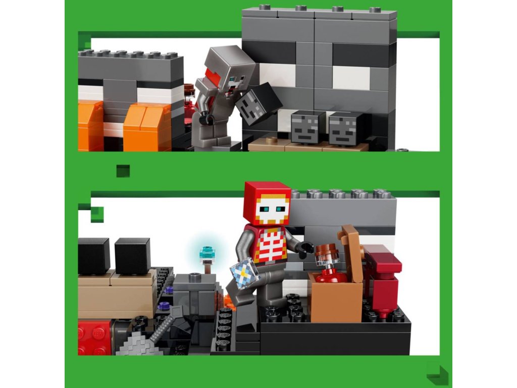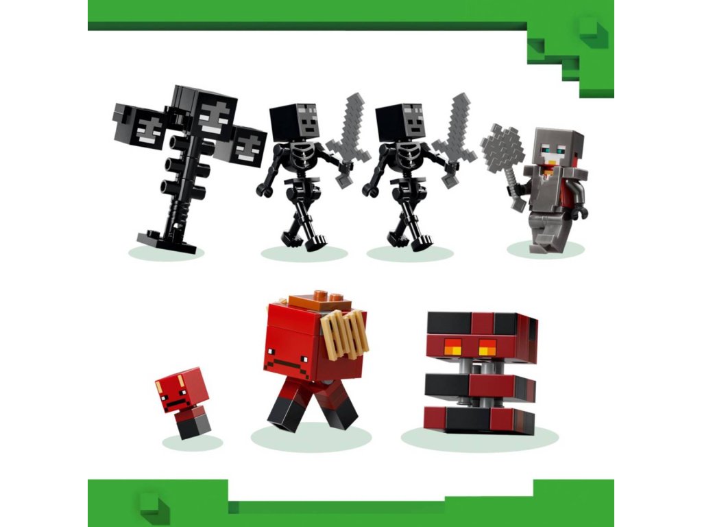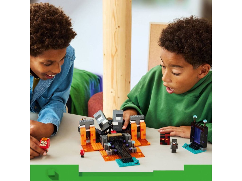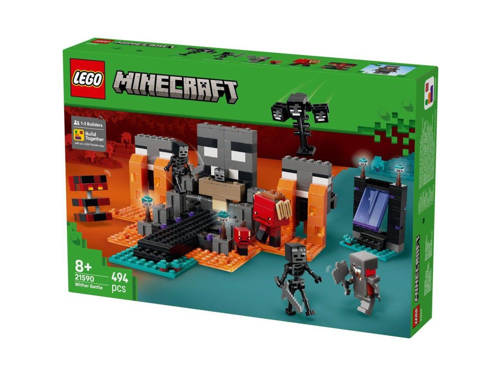 Vydejte se s milovníky Minecraftu do nekonečného světa fantazie se stavebnicí Souboj s Witherem pro holky a kluky od 8 let. Děti se připojí ke karmínovému válečníkovi, který se v deštivém lesním biomu utká se dvěma kostlivci a dalšími nepřáteli a čeká ho napínavé dobrodružství. Tato stavebnice plná akce a autentických detailů ze hry Minecraft obsahuje postavy ze hry, jako je karmínový válečník, 2 Wither kostlivci, chodec, pekelný sliz a sestavitelný Wither. Portál do Netheru a svatyně s pracovním stolem a skrytým Witherem, kterého můžou děti vyvolat výbuchem, vnáší do hry život. Děti si užijí hodiny nápaditého hraní, při kterém budou bojovat s nepřáteli, jezdit na chodci a prožívat velkolepá dobrodružství.