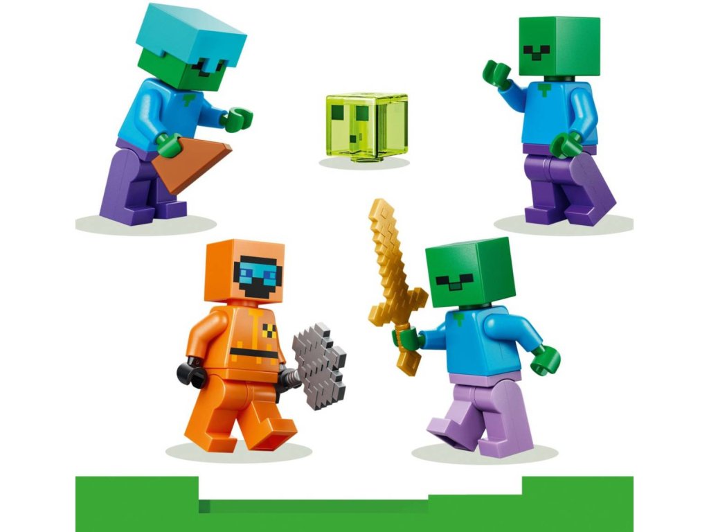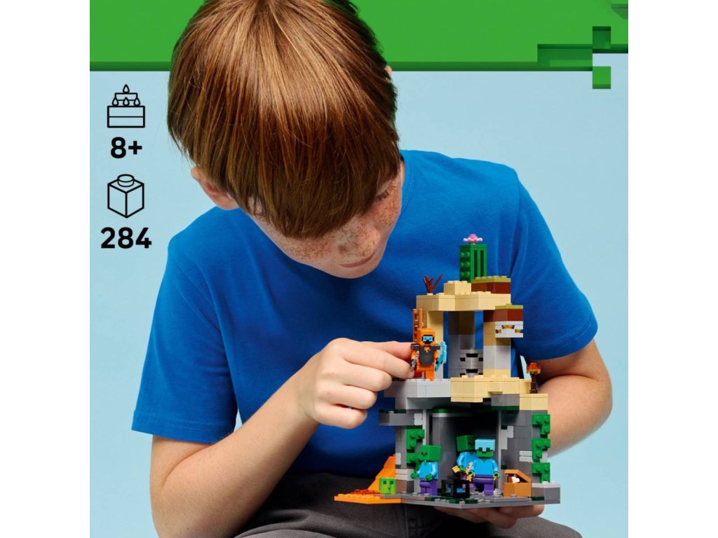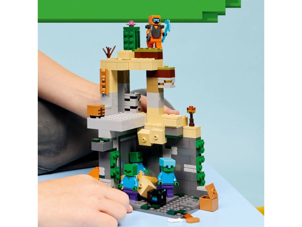 Postavte se hordě zombie se stavebnicí Zombie kobka pro holky a kluky od 8 let. Děti se vydají do zombie kobky plné postav ze světa Minecraftu, autentických herních dekorací a zábavných prvků a doplňků. Akční hra se odehrává v pouštním biomu Minecraftu a hlavní roli hraje tulák v pustině vybavený diamantovým krumpáčem, palcátem a brněním z netheritu. Součástí je také sliz a 3 zombie, z nichž jedno má kouzelné nohavice a zlatý meč a další má diamantovou helmu. Mezi zábavné funkce patří otočná komora, ve které se objevují zombie, a posuvný díl, který spouští sesuv kamení. Další nápadité doplňky zahrnují pracovní stůl, pochodeň a truhlu s chlebem, kostí a shnilým masem.
