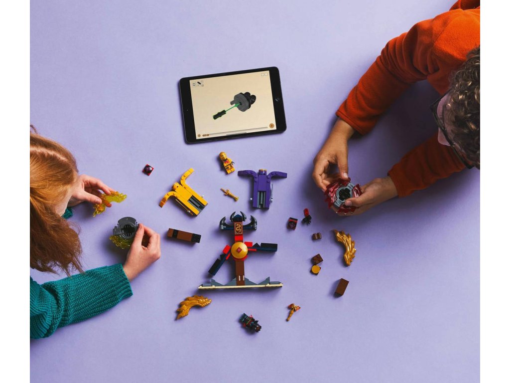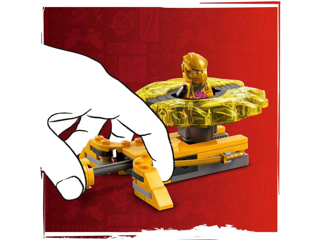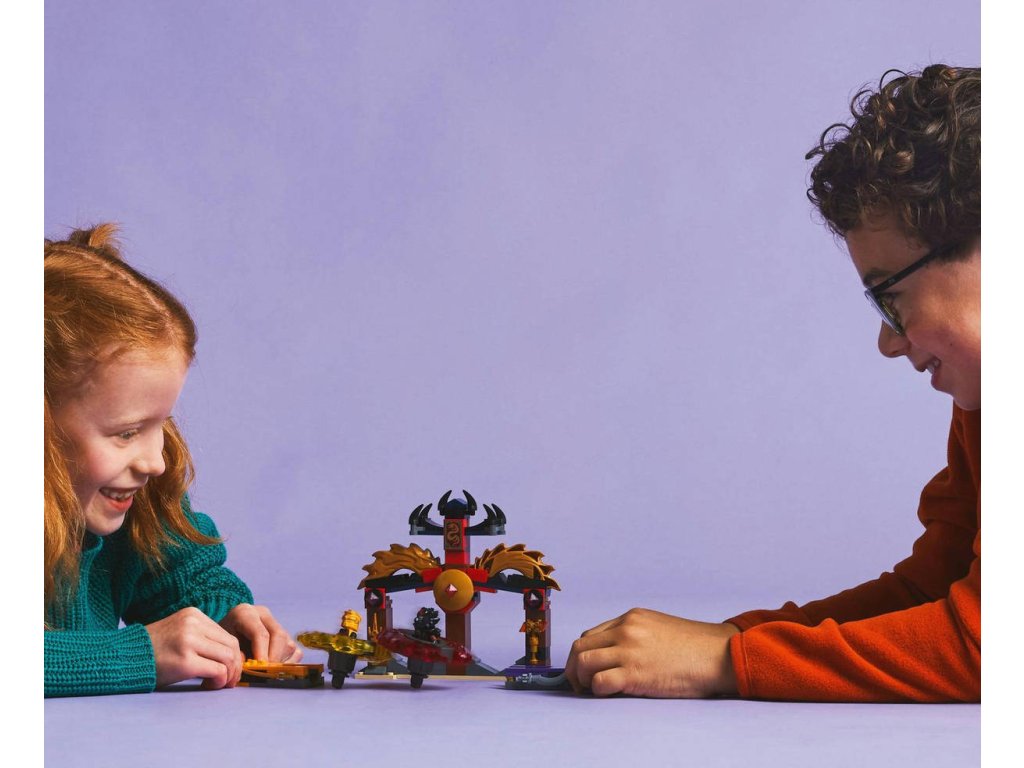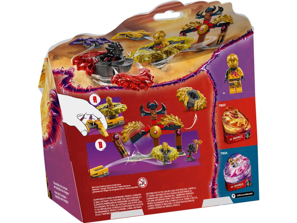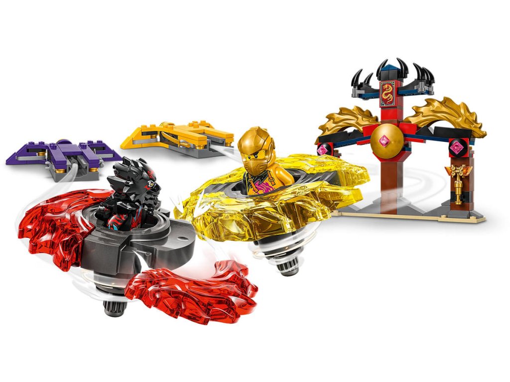 S akční stavebnicí Bitevní balíček dračího Spinjitzu si kluci a holky od 6 let připomenou úžasné akční scény ze 3. řady televizního seriálu NINJAGO Dračí povstání. Tato malá akční stavebnice LEGO obsahuje model chrámu s bojovou arénou, 2minifigurky Arina a Rase a 2 dračí Spinjitzu spinnery, které děti umístí do odpalovačů a během bitev je proto sobě vystřelovat. Děti si vychutnají napínavé dobrodružné souboje dobra proti zlu s Arinovým žlutým spinnerem a Rasovým červeným spinnerem, kt eré mají odnímatelné dílky síly. Tyto postavy ze světa NINJAGO můžou své spinnery vylepšovat zlatými prvky, které můžou vyhrát zasažením a zničením bojové arény.