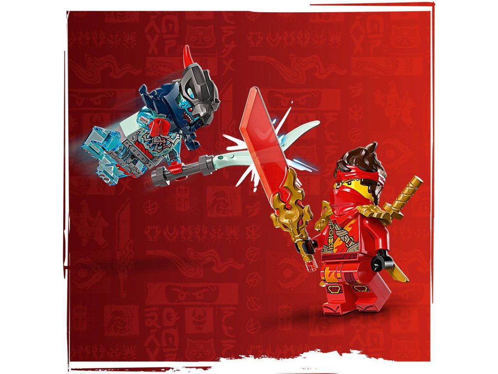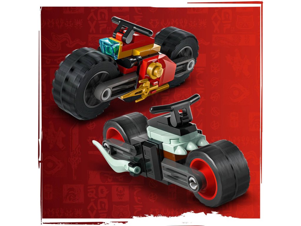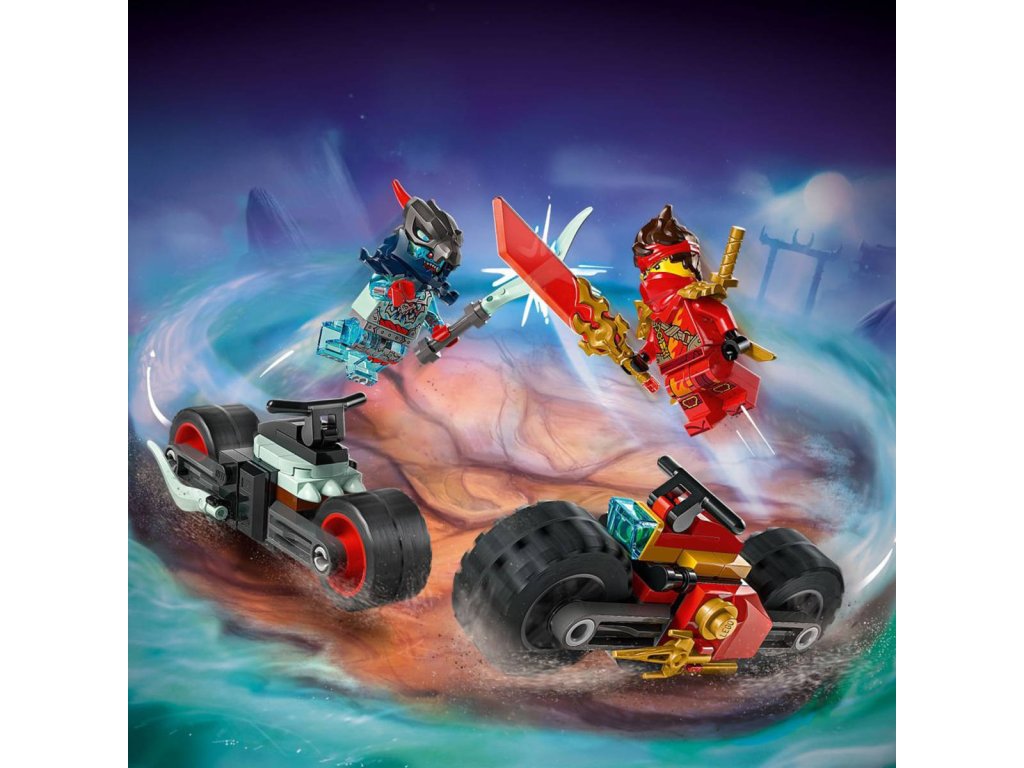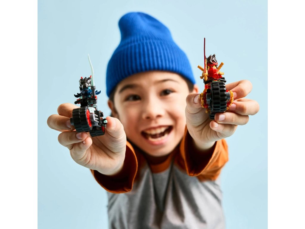 Se stavebnicí Kai a závody na motorkách si kluci a holky od 6 let připomenou akční scény z 3. řady televizního seriálu NINJAGO Dračí povstání. Tato akcí nabitá stavebnice obsahuje 2 nindžovské motorky s pohyblivými koly: Kaiovu závodní motorku ozdobenou 2 dýkami a démonickou motorku Přízračného dračího zvěda. Tato nindžovská stavebnice obsahuje 2 minifigurky NINJAGO, které můžou řídit motorky: Kaie vyzbrojeného průsvitnou odhalující čepelí a 2 zlatými katanami a Přízračného dračího zvěda s mečem. Děti si s touto stavebnicí užijí hodiny kreativního hraní na bitvy dobra proti zlu, ať už sólo nebo s kamarády.