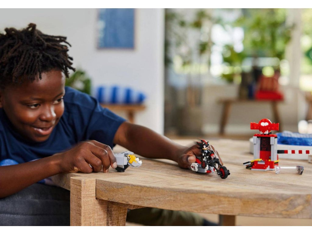 Se zábavnou stavebnicí Shadow the Hedgehog a jeho útěk si děti od 8 let užijí hodiny akčního hraní. Stejně jako postavy z oblíbené videohry se i děti mohou těšit na úžasná dobrodružství. Vychutnají si stavění modelu i Shadowův úprk ze stázové komory v laboratoři. Hrdina usedne na motorku, projede kolem padající barikády, zničí Badnika RhinoBota – a tak pustí na svobodu Cluckyho – a dá se na útěk. Stavebnice je nabitá herními možnostmi, které podněcují kvyprávění příběhů. Děti mohou vymyslet nespočet způsobů, jakými Shadow přemůže RhinoBota, než se na své motorce vydá na útěk. V řadě LEGO Sonic the Hedgehog se snoubí rychlé akční hraní s kreativním stavěním. Děti a fandové Modré šmouhy si vychutnají tvorbu inspirativních scén se 3 oblíbenými akčními figurkami ze slavné hry. Děti se mohou těšit na nenáročné a intuitivní stavitelské dobrodružství s aplikací LEGO Builder. V ní si lze přibližovat a otáčet modely ve 3D, ukládat stavebnice a sledovat postup.