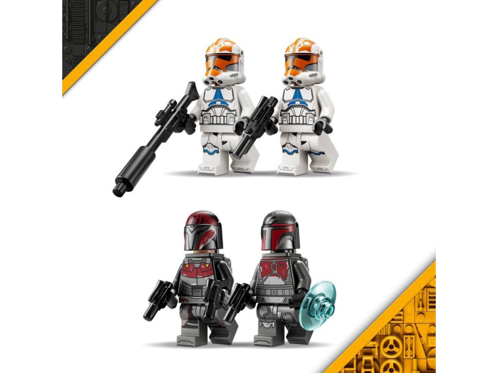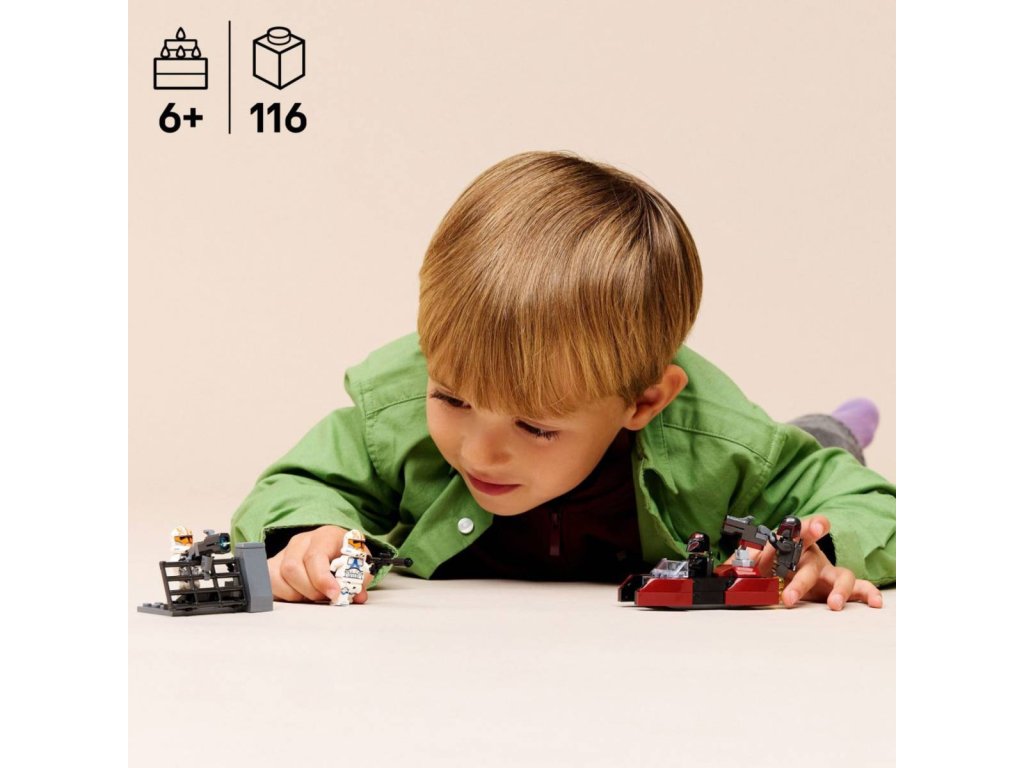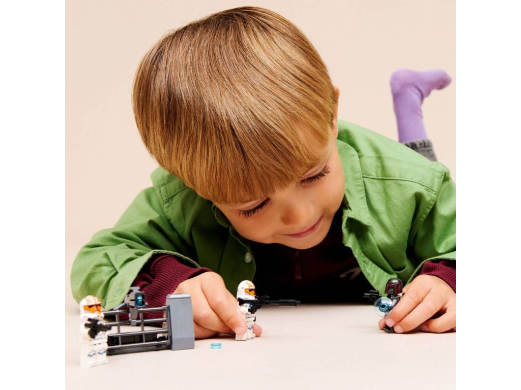 Potěšte děti úžasným Bitevním balíčkem obléhání Mandalore, se kterým si můžou zahrát na vlastní verzi obléhání planety Mandalore ze seriálu Star Wars: Klonové války. Tato stavebnice obsahuje 4 minifigurky LEGO® Star Wars™ – dva členy mandalorianského super komanda a 2 Ahsoka verze klonovaných vojáků z 332. legie. Nechybí mandalorianský spídr, barikáda klonových vojáků a spousta doplňků pro akční hraní. Aktivujte vystřelovací blaster spídru a zaútočte zpět pomocí vystřelovače namontovaného na barikádě. Nasaďte si tryskové batohy komanda a zaútočte ze vzduchu pomocí blasterových pistolí. Tato stavebnice podněcuje dětskou fantazii a představuje skvělý dárek pro kluky, holky a fanoušky Star Wars od 6 let.