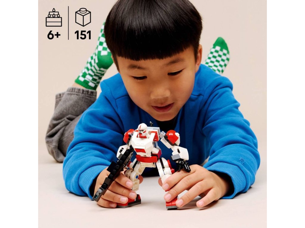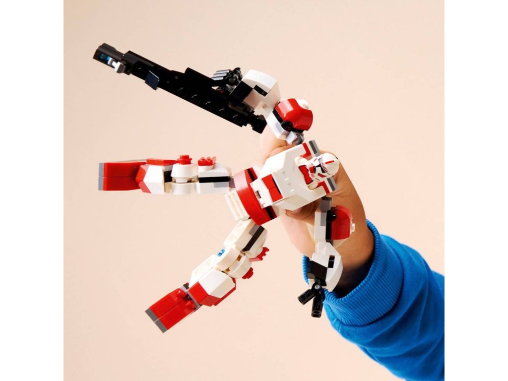 Seznamte malé děti s fascinujícím světem LEGO® Star Wars™ díky stavebnici Robotický oblek klonového šokového vojáka. Tato pohyblivá figurka robotického obleku je navržena ke snadnému sestavení, aby se děti mohly hned pustit do akčního hraní. Model poslouží jako skvělý dáreček pro kluky, holky a fanoušky Star Wars od 6 let. Umístěte minifigurku LEGO klonového šokového vojáka do kokpitu robotického obleku a připevněte jeho blasterovou pušku k zadní části obleku. Upravte ruce a nohy obleku do bojových postojů. Umístěte velkou blasterovou pušku do silných rukou robotického obleku a aktivujte jeho vystřelovač. Díky charakteristickému červeno-bílému barevnému provedení klonových šokových vojáků se bude oblek mezi misemi skvěle vyjímat i na výstavce v dětském pokoji.