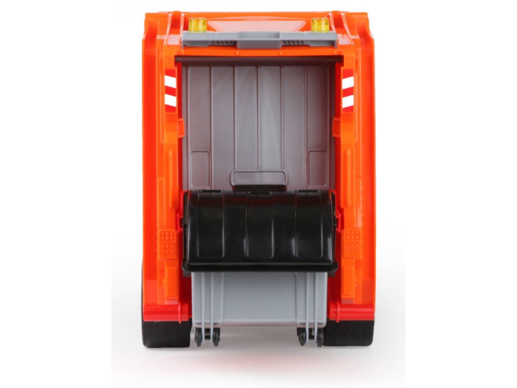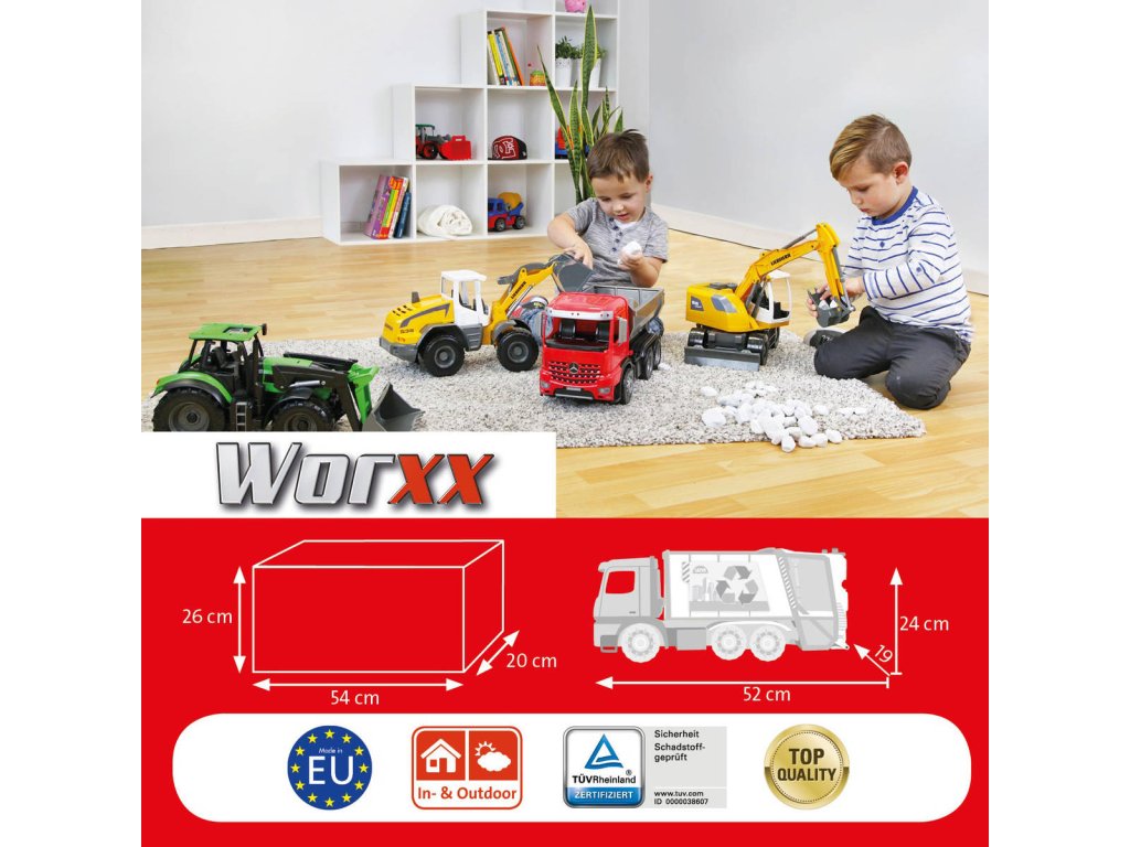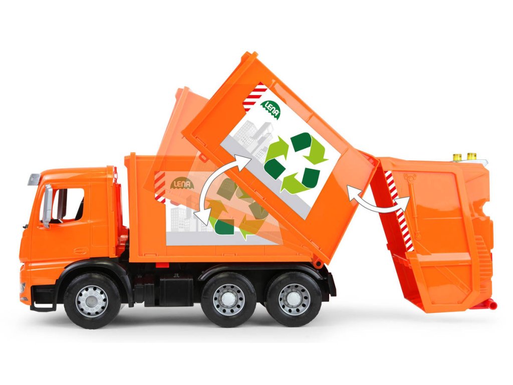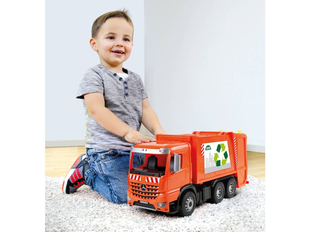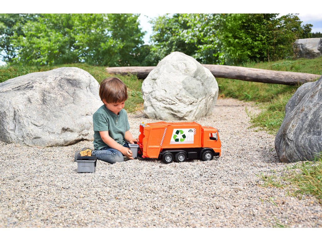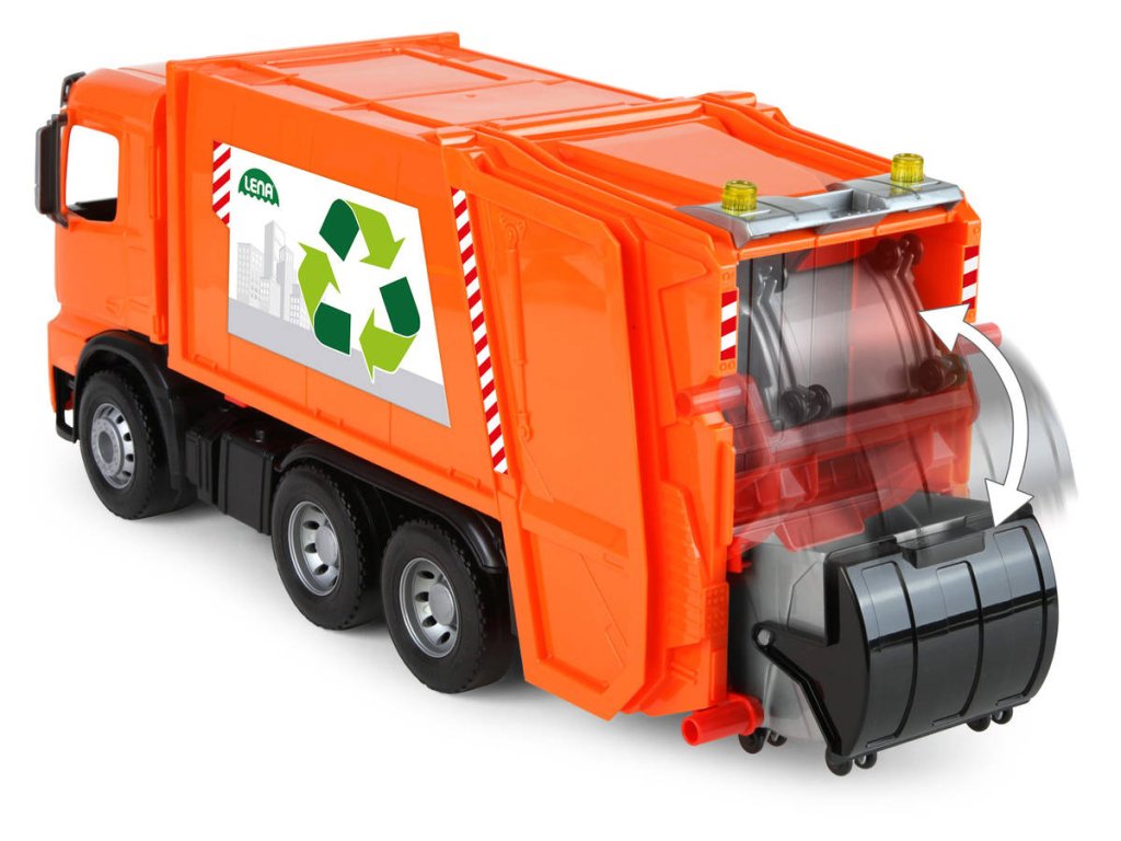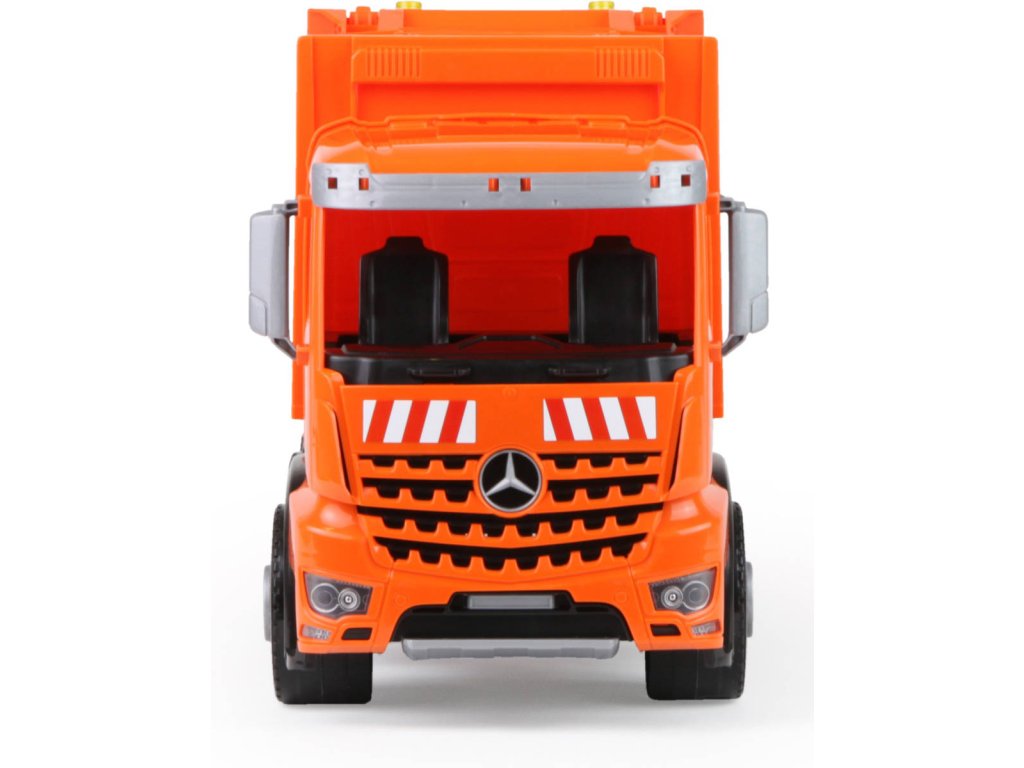 Popelářský vůz Mercedes-Benz Acrocs z řady Lena Worxx. Kvalitní plast, funkční části, pevná konstrukce, součástí 2 popelnice, bez kartonu, velikost 52cm