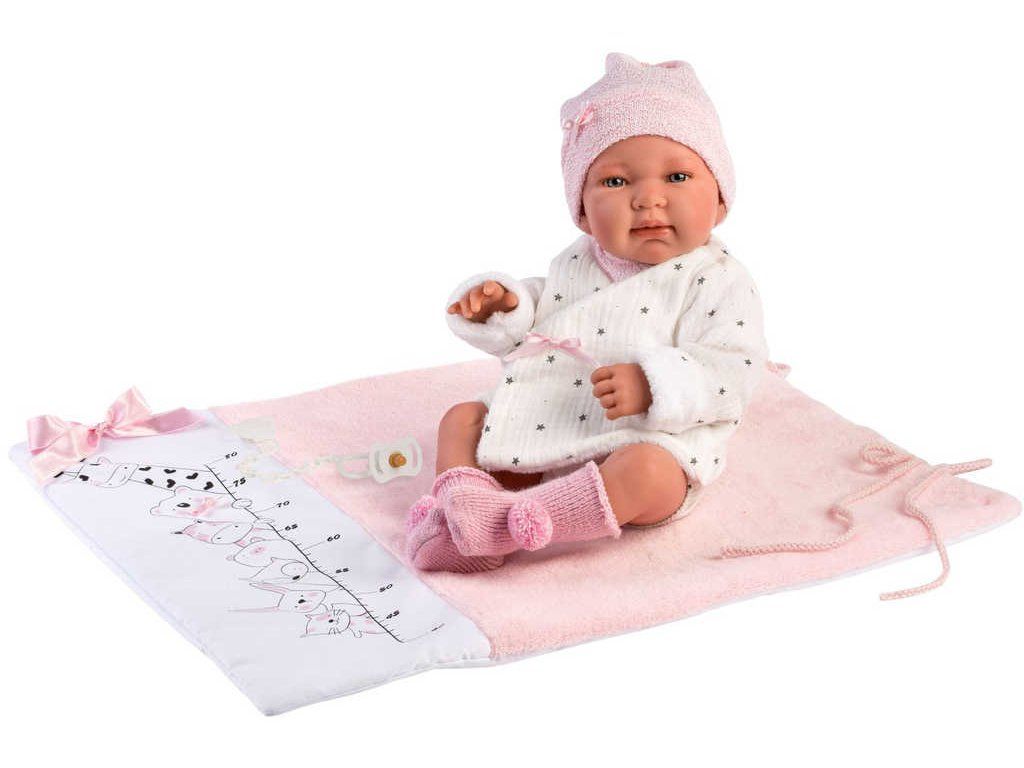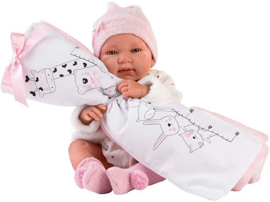 5dílný obleček pro panenku - holčičku, s ozdobnou podložkou, na které je graficky znázorněný metr se zvířátky a s jednorázovou plínkou pro panenku miminko NEW BORN Llorens velikosti 43-44 cm. Vyrobeno ve Španělsku, baleno v igelitovém obalu s plastovým nebo kartonovým ramínkem.