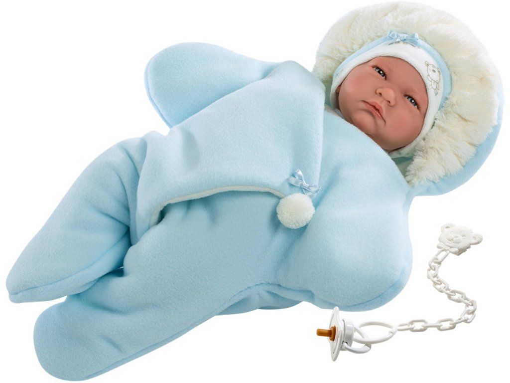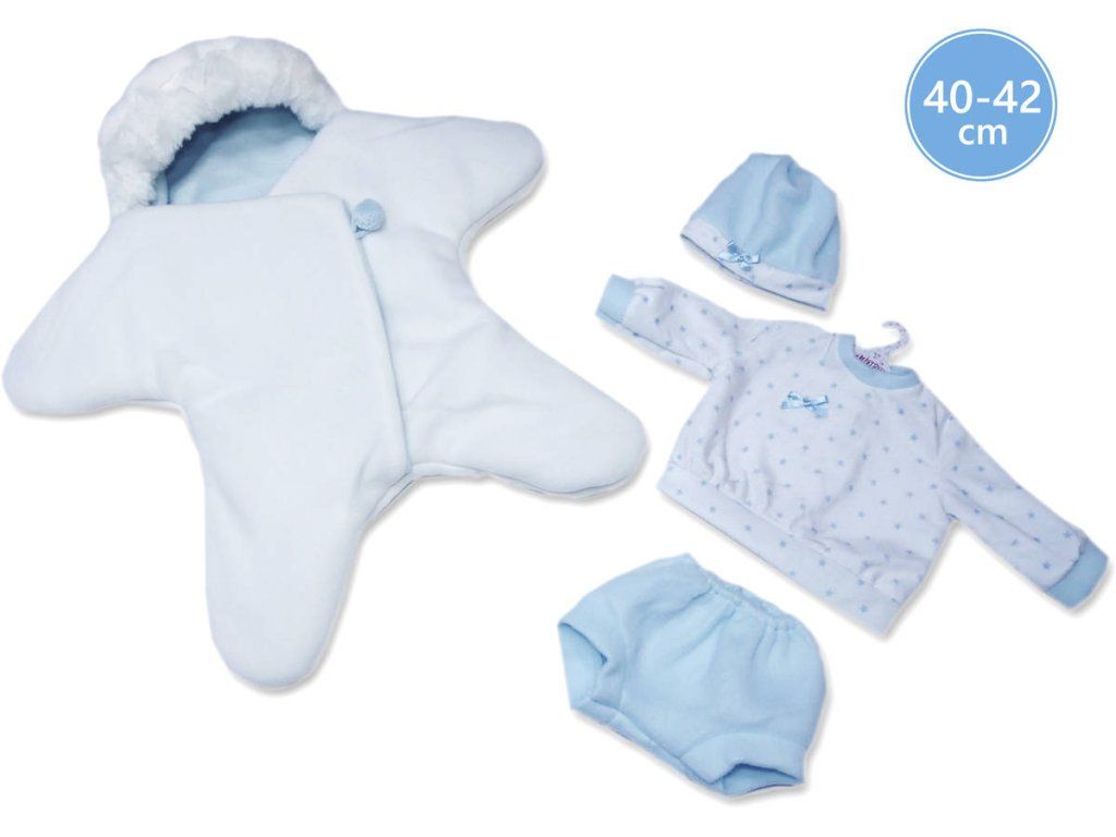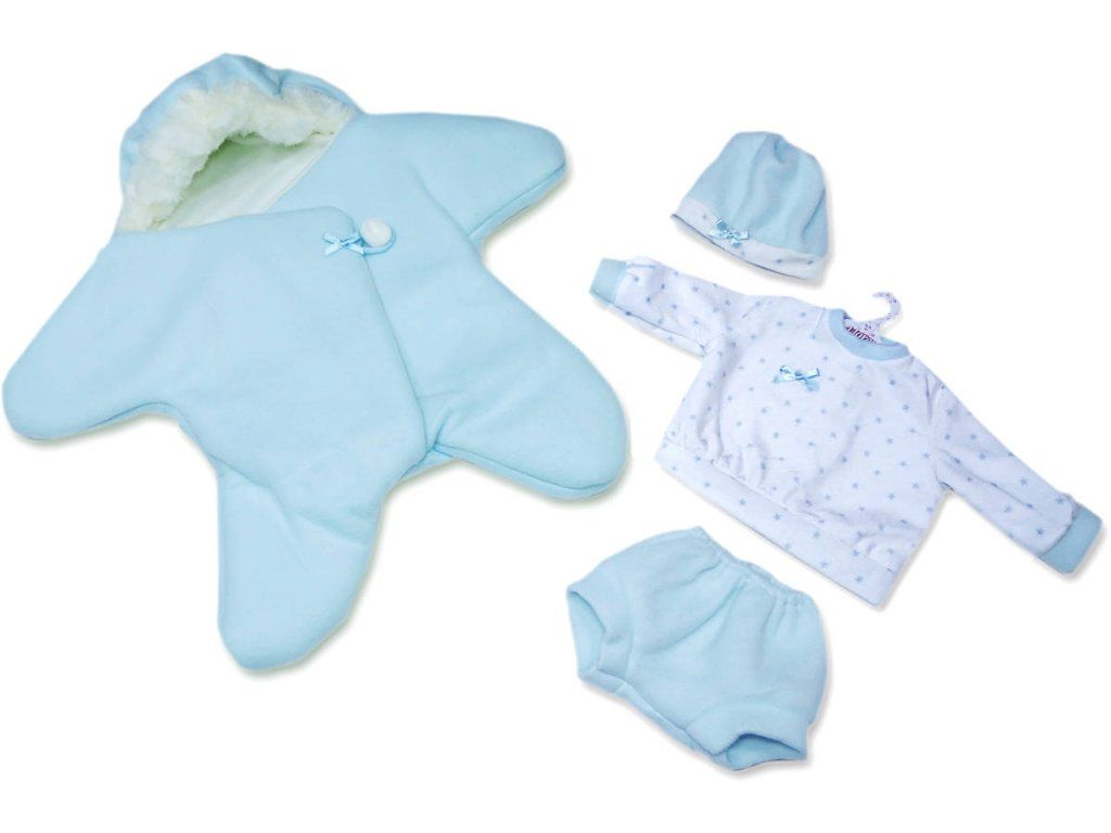 3dílný obleček s oboustranným fleecovým overalem ve tvaru hvězdy pro panenku miminko NEW BORN Llorens velikosti 40-42 cm. Vyrobeno ve Španělsku, baleno v igelitovém obalu s plastovým nebo kartonovým ramínkem.