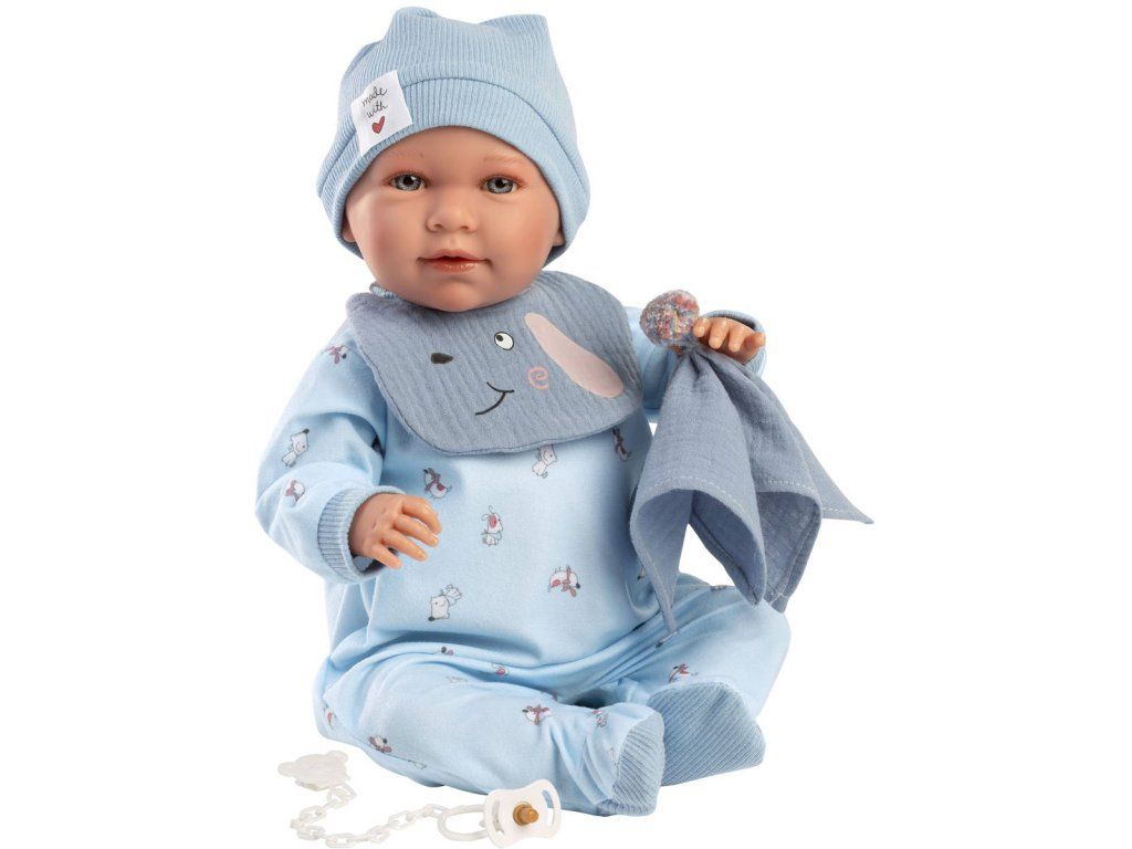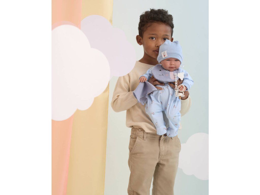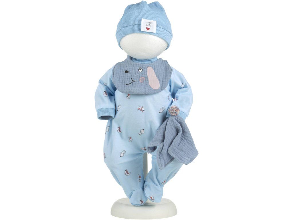 4dílný set: 2 kusy oblečení, bryndáček a ozdobný muchlík pro panenku miminko NEW BORN Llorens velikosti 40–42 cm. Vyrobeno ručně ve Španělsku, baleno v igelitovém obalu s plastovým ramínkem.
