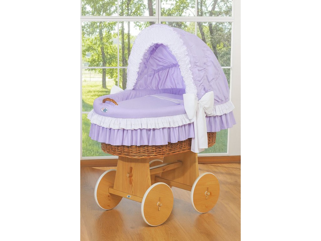 9) dřevěný podvozek je stabilní, pevný a vysoký (není třeba se nahýbat k dítěti oproti jiným košům). Čtyři veliké dřevěné kolečka s bílými gumami, které zajišťují, aby na podlaze nezůstavaly žádné stopy.