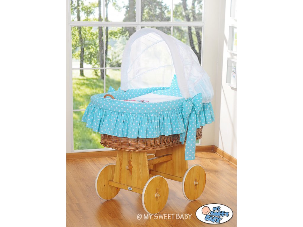 9) dřevěný podvozek je stabilní, pevný a vysoký (není třeba se nahýbat k dítěti oproti jiným košům). Čtyři veliké dřevěné kolečka s bílými gumami, které zajišťují, aby na podlaze nezůstavaly žádné stopy.