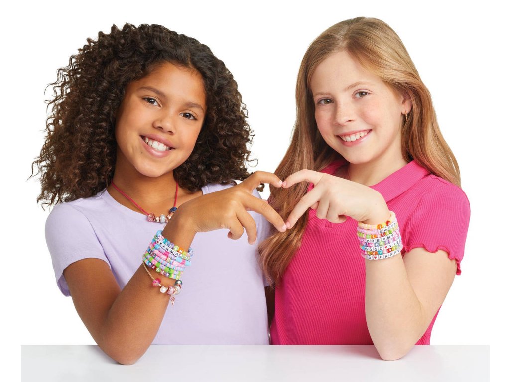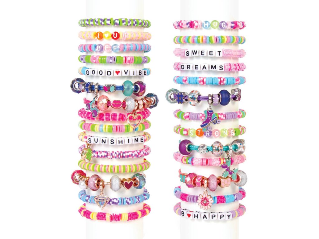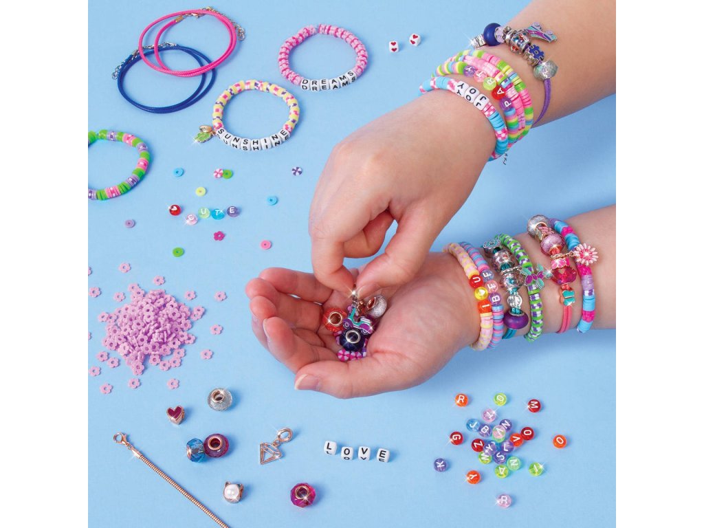 Vytvářej náramky podle nejnovějších módních trendů! S touto sadou můžeš vyrobit více než 30 náramků pomocí přiložených šňůrek, řetízků, různých přívěsků a více než 2100 korálků. Využij celou nabídku halo přívěsků, heishi korálků a písmenkových korálků k výrobě přátelských náramků a vyměňuj je s kamarády… možnosti jsou nekonečné!