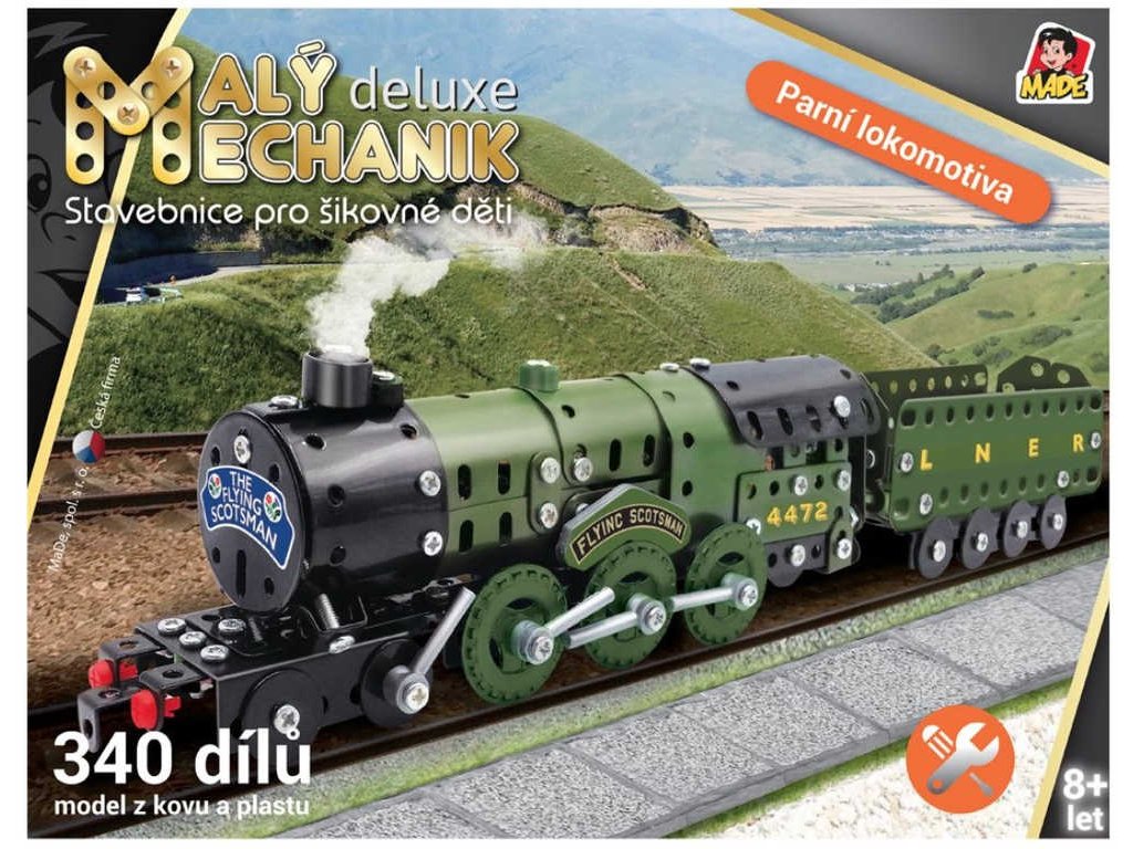 MALÝ MECHANIK Parní lokomotiva 340 dílků kovová STAVEBNICE typu Merkur