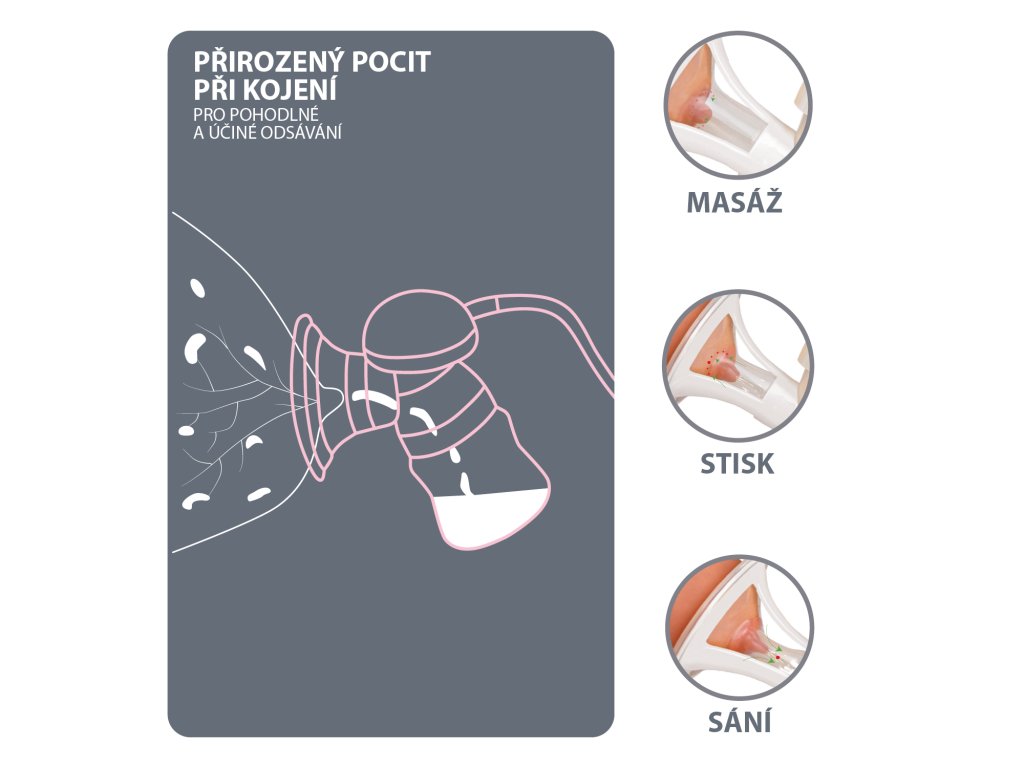 Unikátní technologie, která dokonale napodobuje přirozené sání dítěte. Zaručí maximální efektivitu a bezbolestné odsávání.