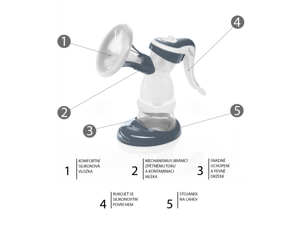 Součástí balení je návod, odsávačka, držák na lahvičku, lahvička, savička, redukce na lahvičku s úzkým hrdlem.
