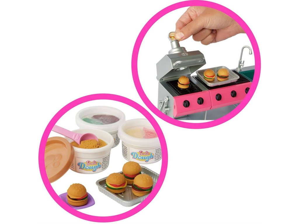 Herní set Barbie Dream Camper nabízí sedm herních zón a více než 60 doplňků pro nezapomenutelné zážitky v přírodě! Obytný vůz po rozložení odhalí stan na střeše, obývací pokoj, jídelní kout a koupelnu. Zábava je na každém kroku – můžeš jít rybařit do jezírka, houpat se v závěsném křesle nebo připravit pelíšek pro roztomilé štěňátko. Až přijde čas večeře, použij přiloženou modelínu a připrav pro Barbie a její kamarády (prodávají se samostatně) hamburgery, nebo rozpal gril a sleduj, jak se jídlo „peče“ díky změně barvy! Díky tolika možnostem vyprávění příběhů je Barbie Dream Camper skvělým dárkem pro děti od 3 let, zejména pro ty, které milují pobyt venku a přírodu. Panenky nejsou součástí balení. Barvy a dekorace se mohou lišit.