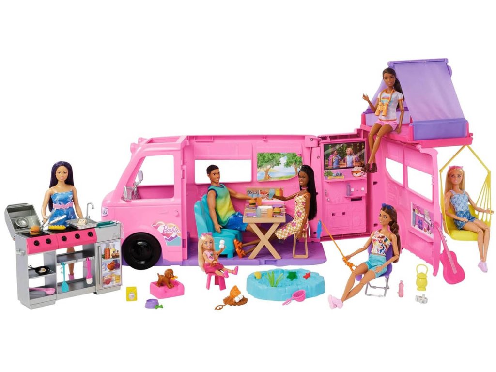 Karavan snů - velký herní set v licenci Barbie. Součástí rozložitelný kempingový automobil, nábytek a vybavení, modelína, makety potravin a další. Celkem 60+ ks.