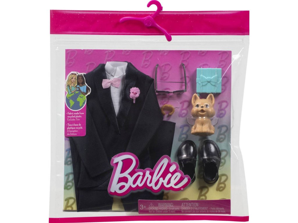 Je to krásný den na svatbu! Děti mohou obléknout panáčka Kena jako ženicha s tímto módním balíčkem Barbie, který obsahuje smoking a doplňky. Ženich bude vypadat dokonale ve stylovém dvoudílném smokingu se saténovými klopami, růžovou broží a růžovým motýlkem. Klasické černé boty dodávají elegantní vzhled! Mezi doplňky patří krabička s prstýnkem, zlaté hodinky a sluneční brýle. Součástí balení je dokonce i štěňátko, které se může připojit ke svatebnímu obřadu!
