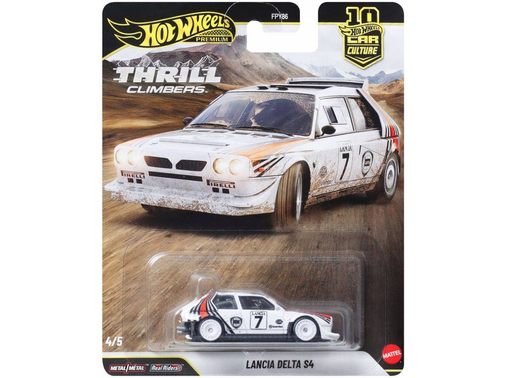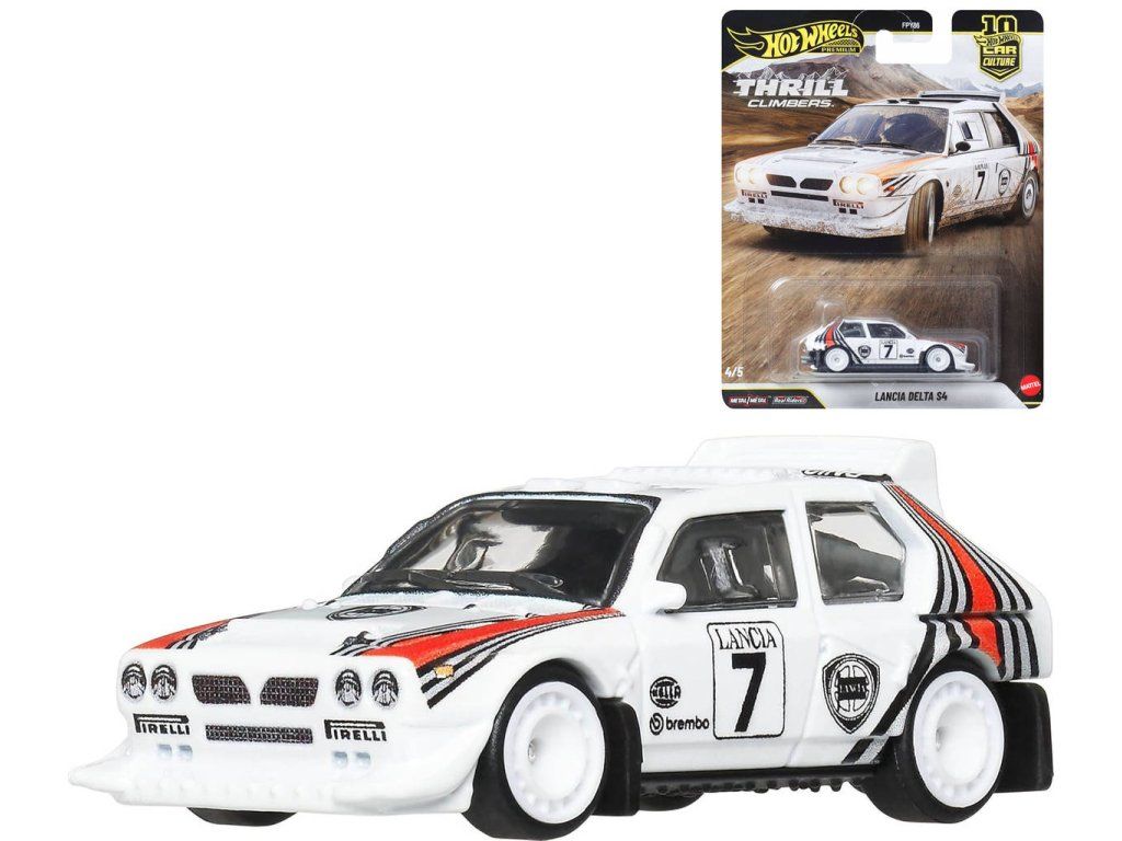 Kovové autíčko angličák Lancia Delta S4 o velikosti 7cm z kolekce Car Culture, v licenci Hot Wheels, od Mattel. 1:64, prémiové zpracování, Real Riders pneumatiky, celokovové.