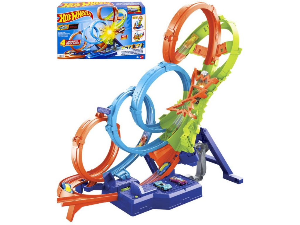 S tímto herním setem dráhy Hot Wheels® se projedete čtyřmi úžasnými smyčkami a trojitou nárazovou zónou. Motorizovaný zrychlovač udržuje angličáky v pohybu, což přináší větší napětí, a výzva spočívá v tom, kolik autíček může závodit najednou, než dojde k nevyhnutelné srážce.