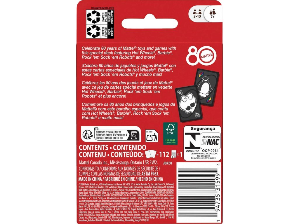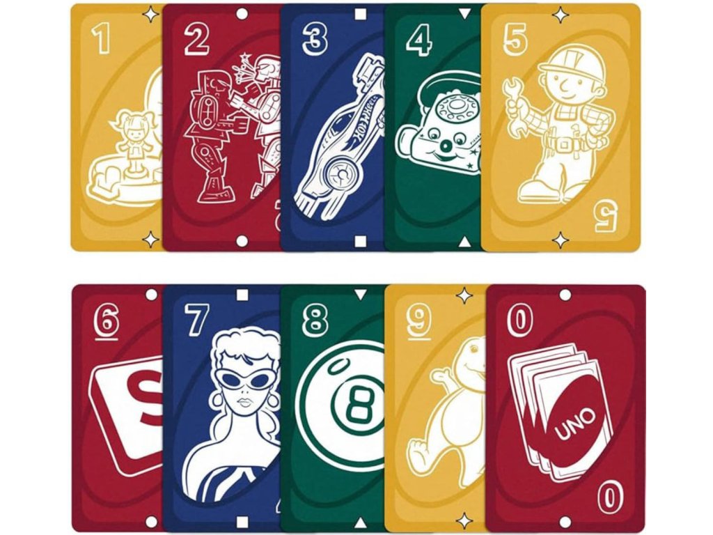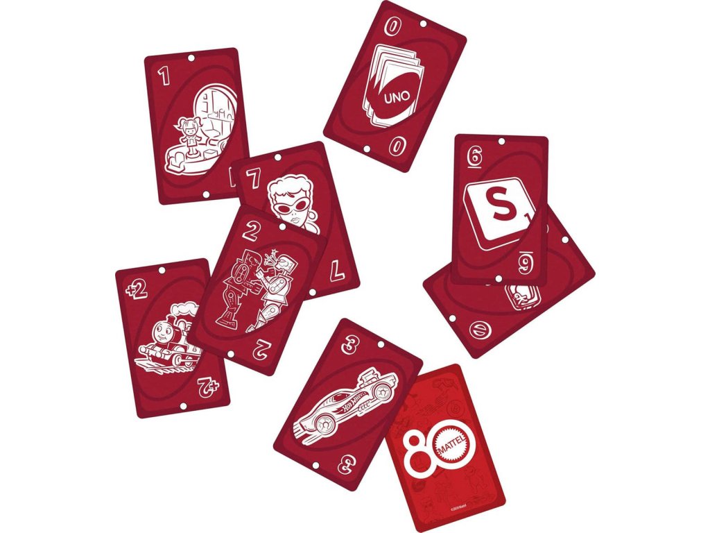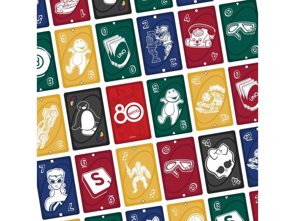 Fanoušci skvělých hraček a her, které společnost Mattel během let vytvořila, si zamilují hru UNO k 80. výročí společnosti. Tento balíček obsahuje grafiku inspirovanou hračkami Mattel, přičemž hráči se snaží spojit barvy a čísla, stejně jako v klasické hře. A když vám zůstane poslední karta, nezapomeňte křičet "UNO!" Skvělý dárek pro fanoušky hraček a her Mattel i milovníky karetních her od 7 let. Barvy a vzhled karet se mohou lišit.