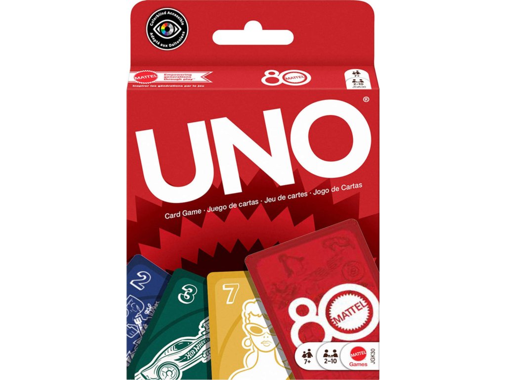 Společenská karetní hra - hrací karty UNO vydané k 80. výročí společnosti Mattel.