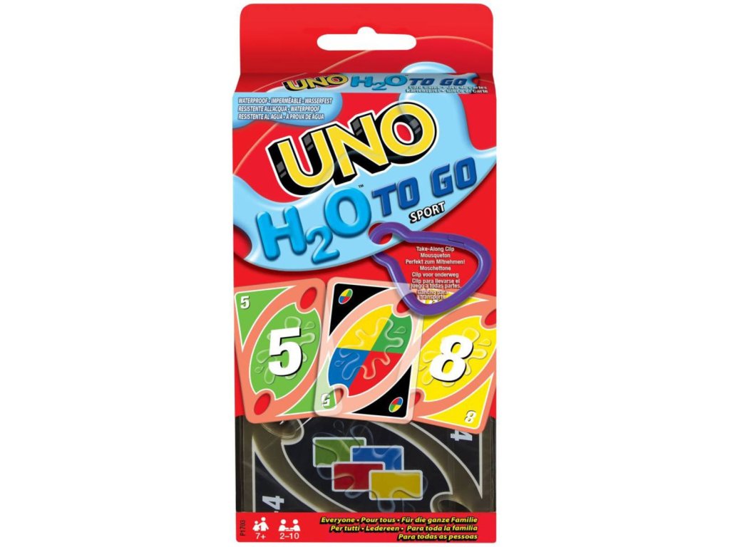 Vezmi s sebou na cesty tuto cestovní verzi hry UNO! Pevné plastové karty jsou odolné vůči vodě a zábavu si s nimi může užít každý, a to doma i venku na cestách. UNO H2O Na cesty obsahuje také praktickou karabinu, která karty udrží při sobě a dá se připojit k plážové tašce, batohu nebo ke kempovací výbavě. Nyní budete připraveni hrát UNO, kdykoliv se vám zachce! Obsahuje 108 karet UNO H20 Na cesty. Vhodné pro hráče od 7 let. Sbírej body a vyhraj, a to klidně i na cestách.