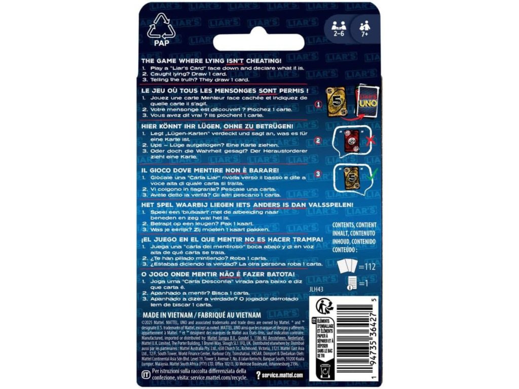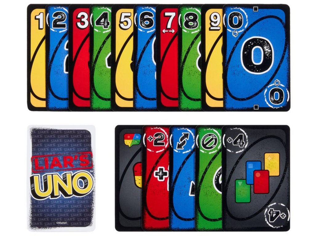 Fanoušci hry UNO si zamilují tuto zábavnou obměnu klasické karetní hry, kde létají lži a vyhrávají ti, kteří umí blafovat! Speciální karta se zahraje lícem dolů a hráč oznámí, co to je. Říká pravdu, nebo klame? Pokud ho někdo vyzve a odhalí lež, musí si vzít kartu. Ale pokud mluvil pravdu, kartu si bere ten, kdo ho vyzval. Udržte kamennou tvář a nezapomeňte při poslední kartě vykřiknout „UNO“! Skvělý dárek pro milovníky karetních her od 7 let. Barvy a vzhled výrobku se mohou lišit