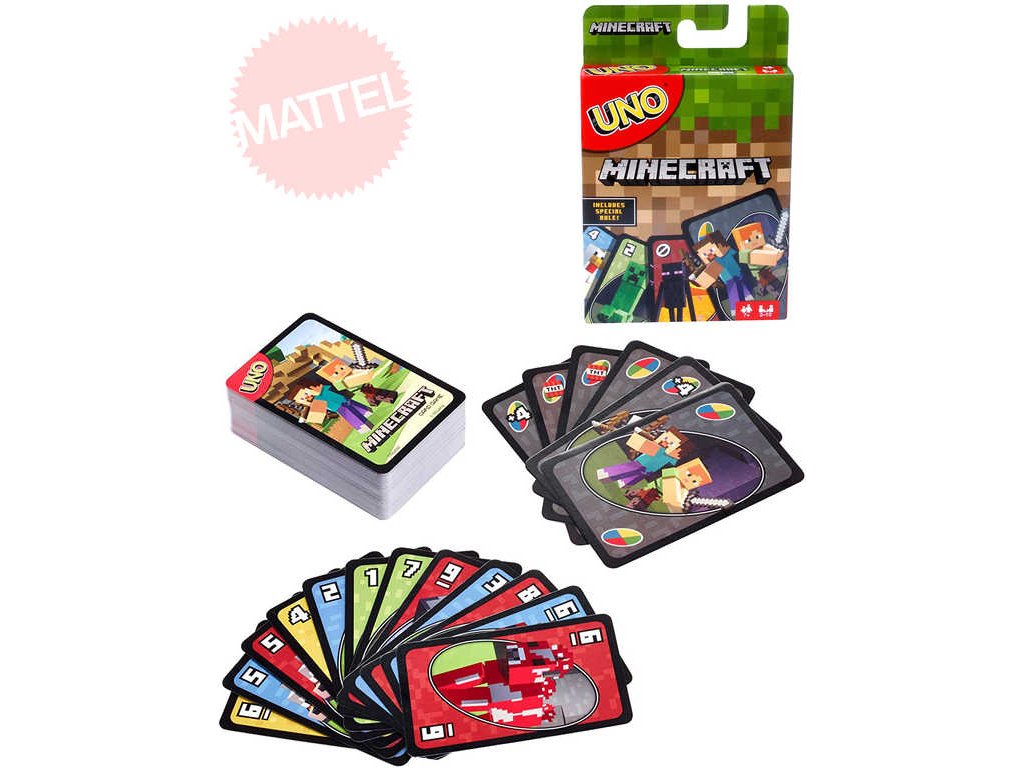 Stejně jako v tolik oblíbené karetní hře UNO™ i v UNO™ Minecraft je cílem hráčů se co nejrychleji zbavit všech karet. Tato verze přináší postavy a motivy z oblíbené hry Minecraft a její součástí je i speciální karta! UNO™ Minecraft navíc přináší nový typ akční karty. Jakmile vám v ruce zbývá poslední karta, nezapomeňte zakřičet „UNO“!