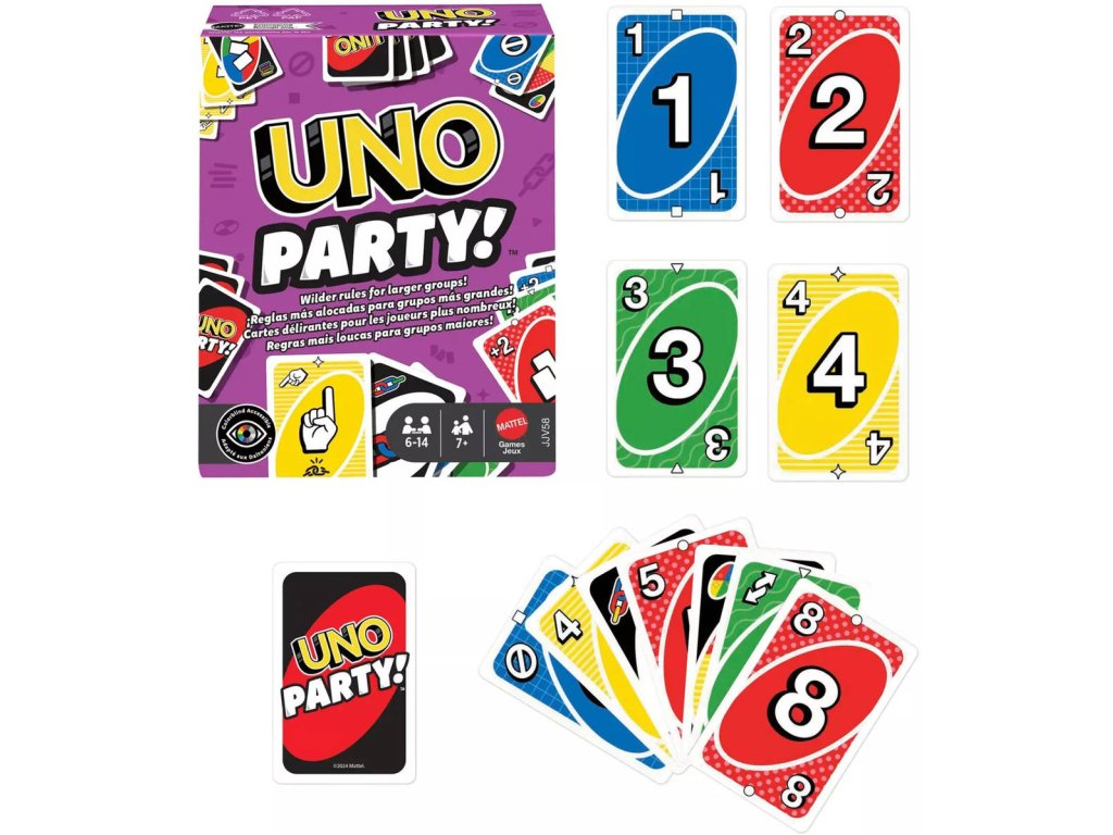Speciální edice oblíbené karetní hry UNO, která se hraje stejně jako klasické UNO – hledáte karty se stejnou barvou, číslem nebo symbolem. Tato verze je upravena pro větší skupiny hráčů, obsahuje více karet a přináší ještě hlasitější, bláznivější a divočejší zábavu. Nezapomeňte vykřiknout „UNO!“, když vám zbývá poslední karta. Přidává i nová pravidla pro interaktivní hru, například kartu „Ukaž na druhého“, kdy musí každý hráč ukázat na jiného – a ten si lízne kartu. UNO Party obsahuje 168 karet, což odpovídá 1,5 balíčku klasického UNO, a je ideální na každou párty nebo rodinné setkání plné smíchu.