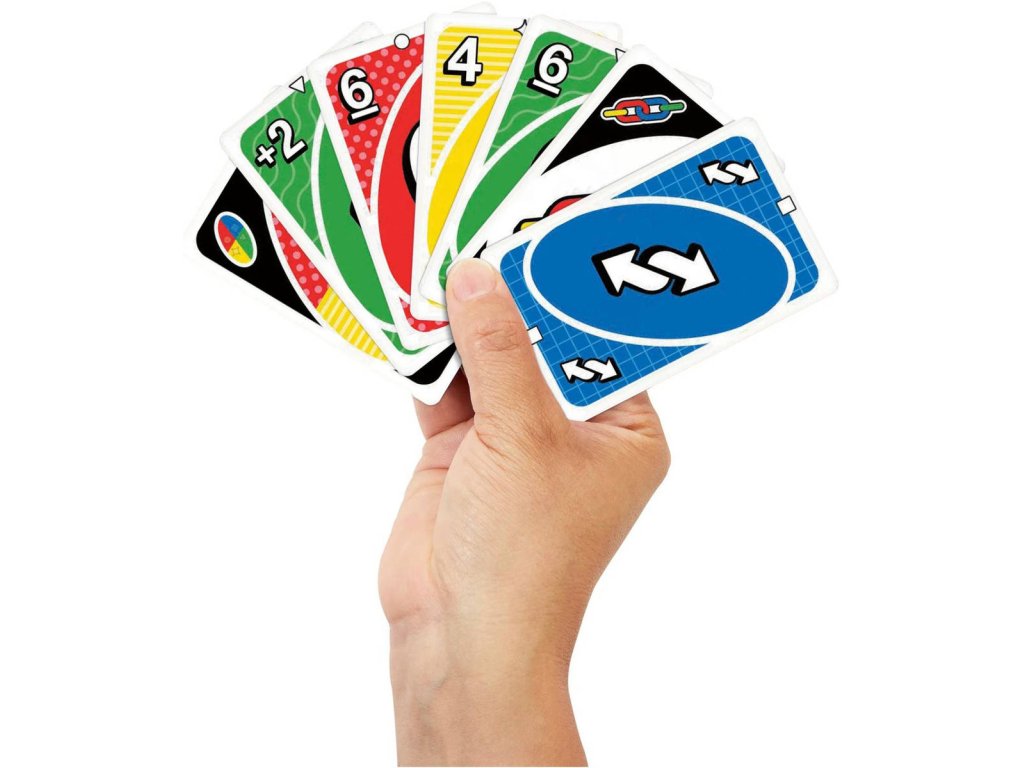Princip hry UNO: Cílem je zbavit se všech karet. Každý hráč dostane 7 karet, zbytek tvoří dobírací balíček. Hráči se střídají a přikládají kartu stejné barvy, čísla nebo symbolu jako je na vrchu odkládacího balíčku. Pokud nemohou, dobírají kartu. Speciální karty potom mění průběh hry. Když hráči zbývá poslední karta, musí říct „UNO" - jinak si dobírá trestné karty.