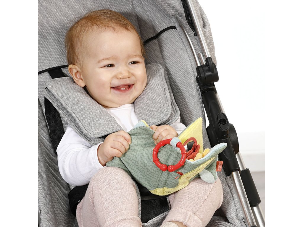 S látkovou plyšovou knížkou mohou děti na 8 stranách oživit roztomilá pravěká stvoření. Každá stránka má různé zábavné efekty jako jsou pískadlo, šustící papír, plyšová vajíčka či zrcátko. Knížka rozvíjí úchop, hmat, fantazii a jemnou motoriku. Praktický upevňovací kroužek dovoluje snadné připevnění na postýlku, kočárku nebo autosedačku.
