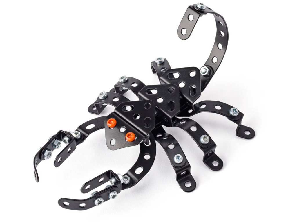MERKUR 8197 Brouci: Škorpion. Kvalitní, kovová konstrukční stavebnice, 93 dílků, model 15cm, součástí návod + pracovní nářadí. Vyrobeno v Česku.